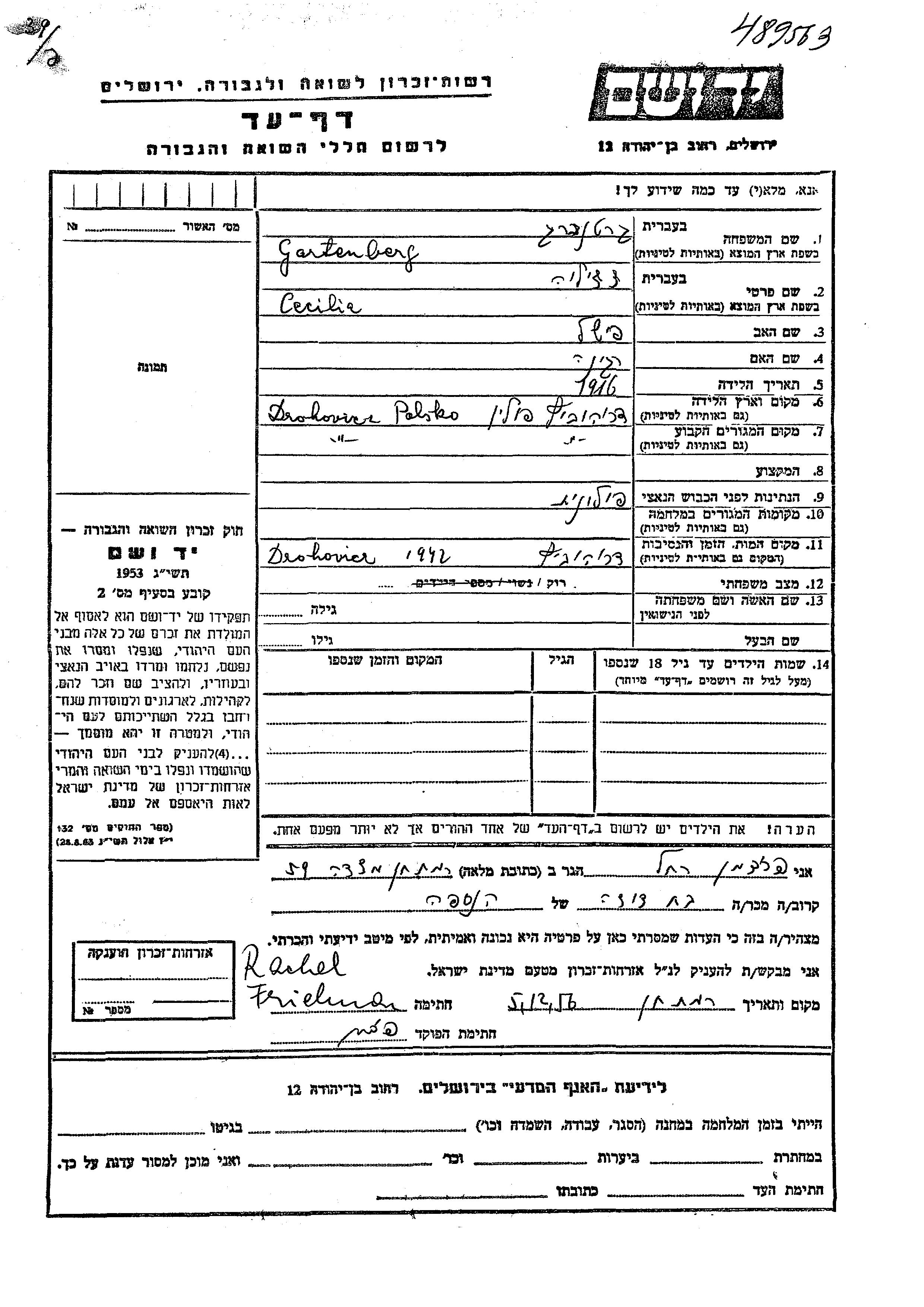 Gartenberg Cecilia 1916 Drohobycz, Pologne Feuille de témoignage