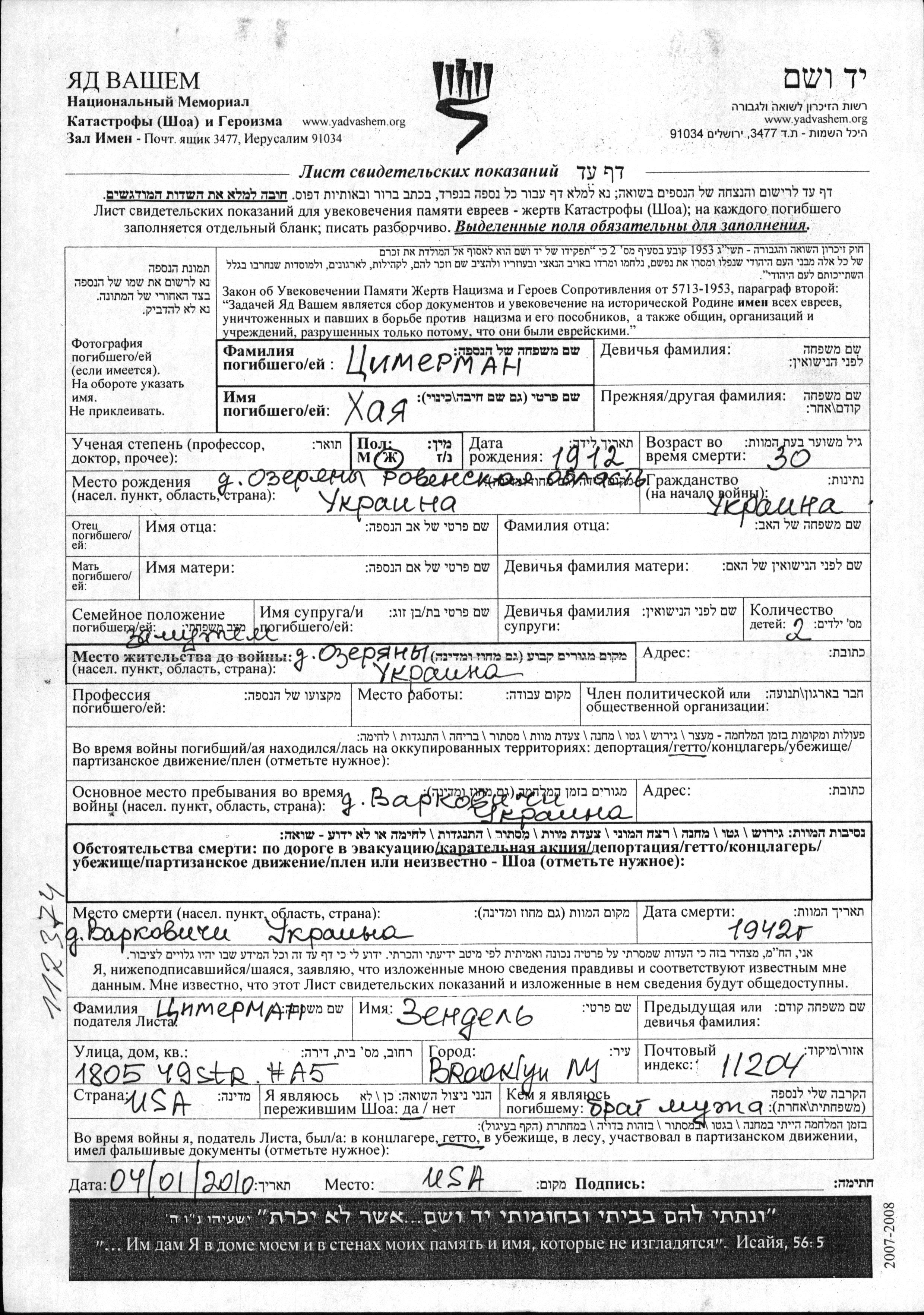 Yad Vashem - Pages of Testimony Names Memorial Collection