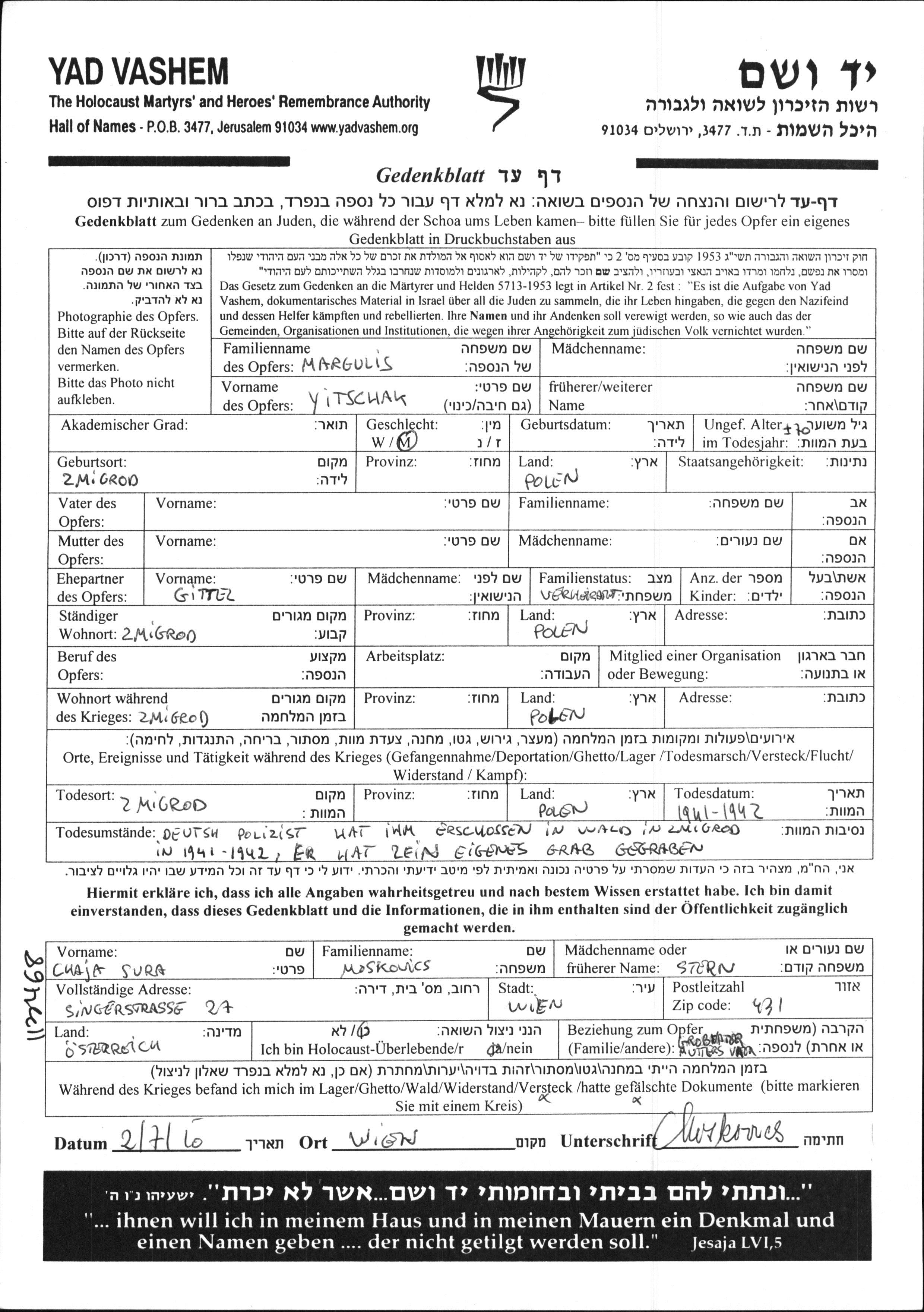 Margulis Yitschak Zmigrod, Pologne Feuille de témoignage