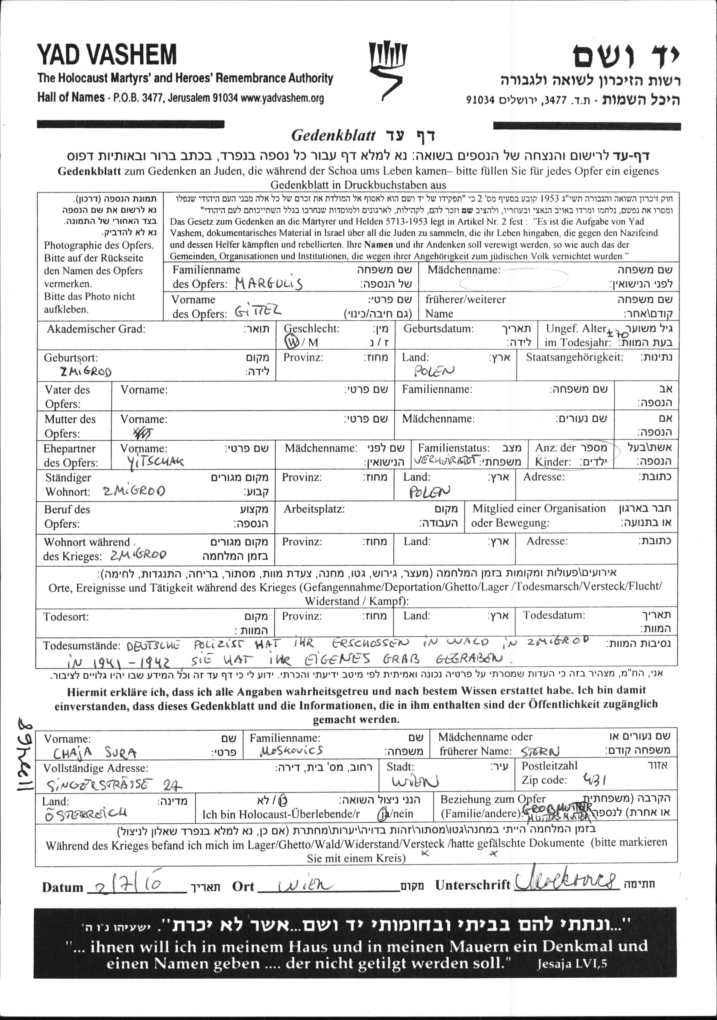 Margulis Gittel Zmigrod, Pologne Feuille de témoignage