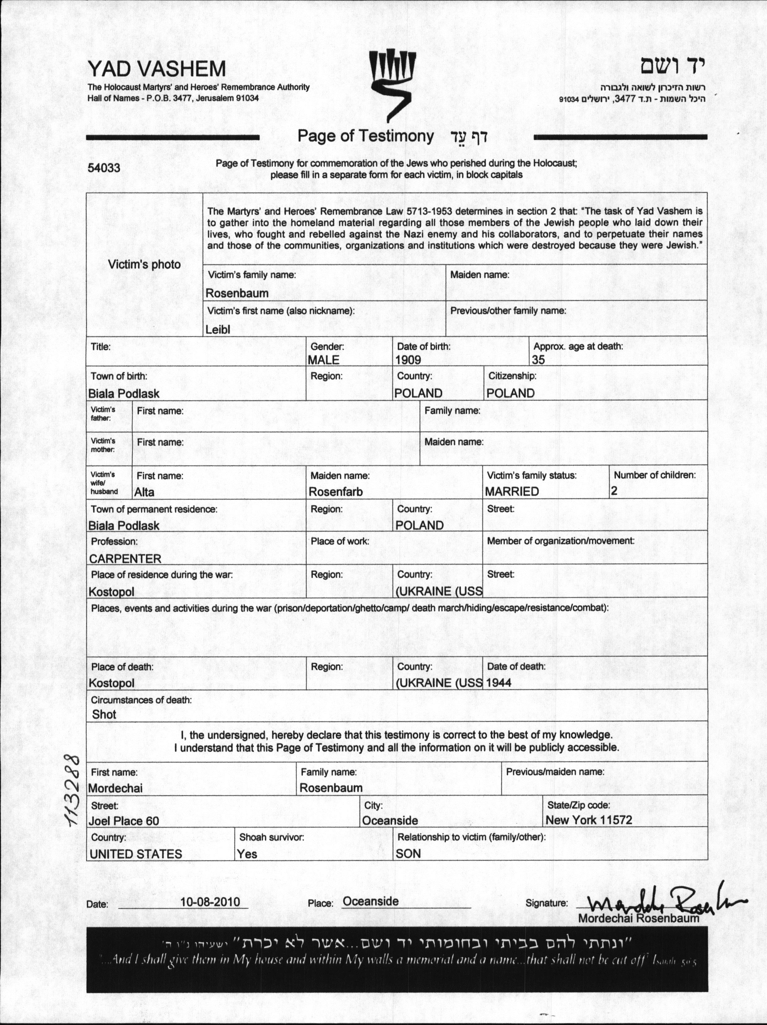 Leibl Rosenbaum est né à Biala Podlaska, Pologne en 1909. Il était Charpentier et Mariée à Alta née Rosenfarb. Avant la seconde guerre mondiale il vivait à Biala Podlaska, Pologne. Au cours de la guerre, il était à Kostopol, Pologne.