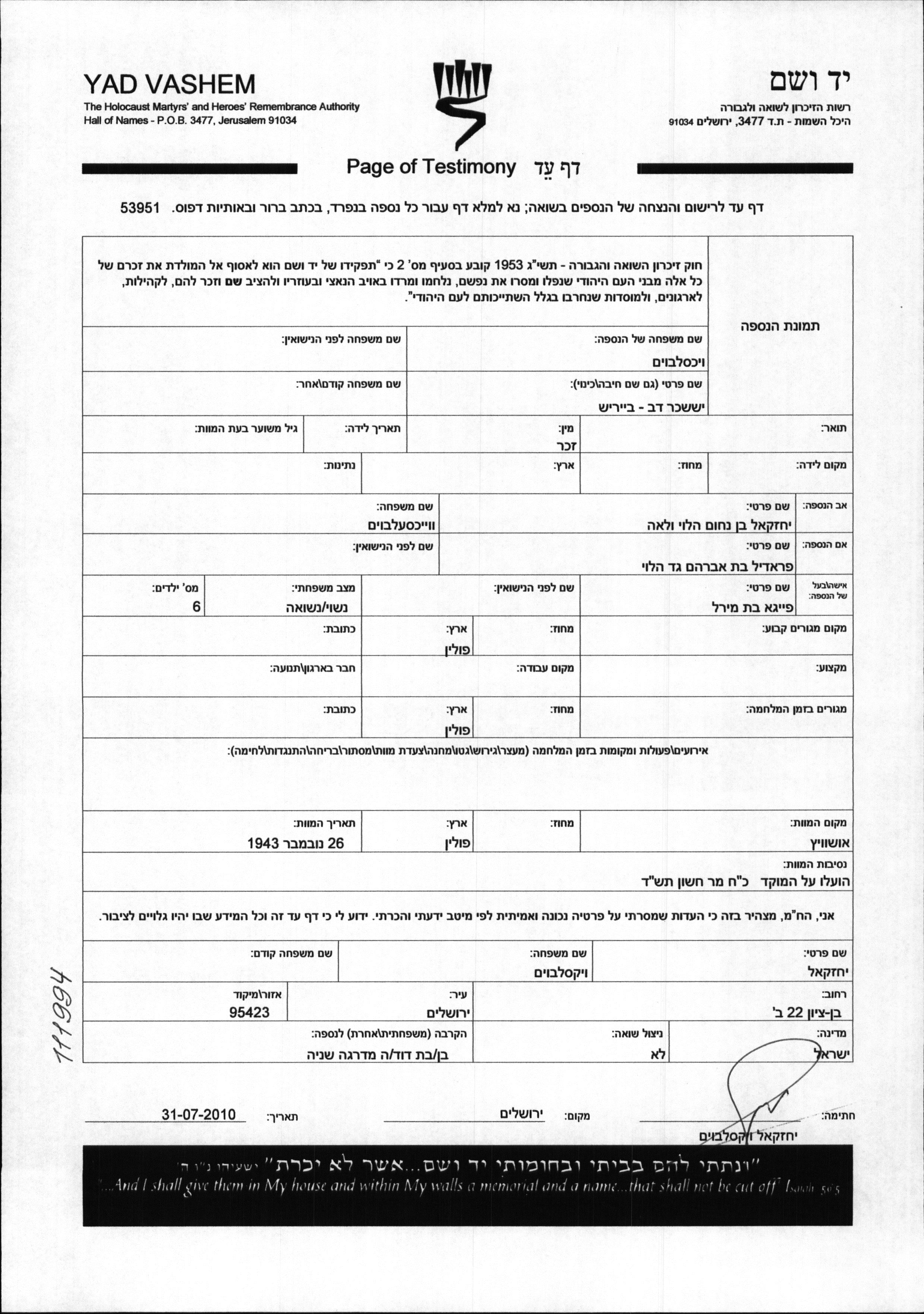 Yad Vashem - Pages of Testimony Names Memorial Collection