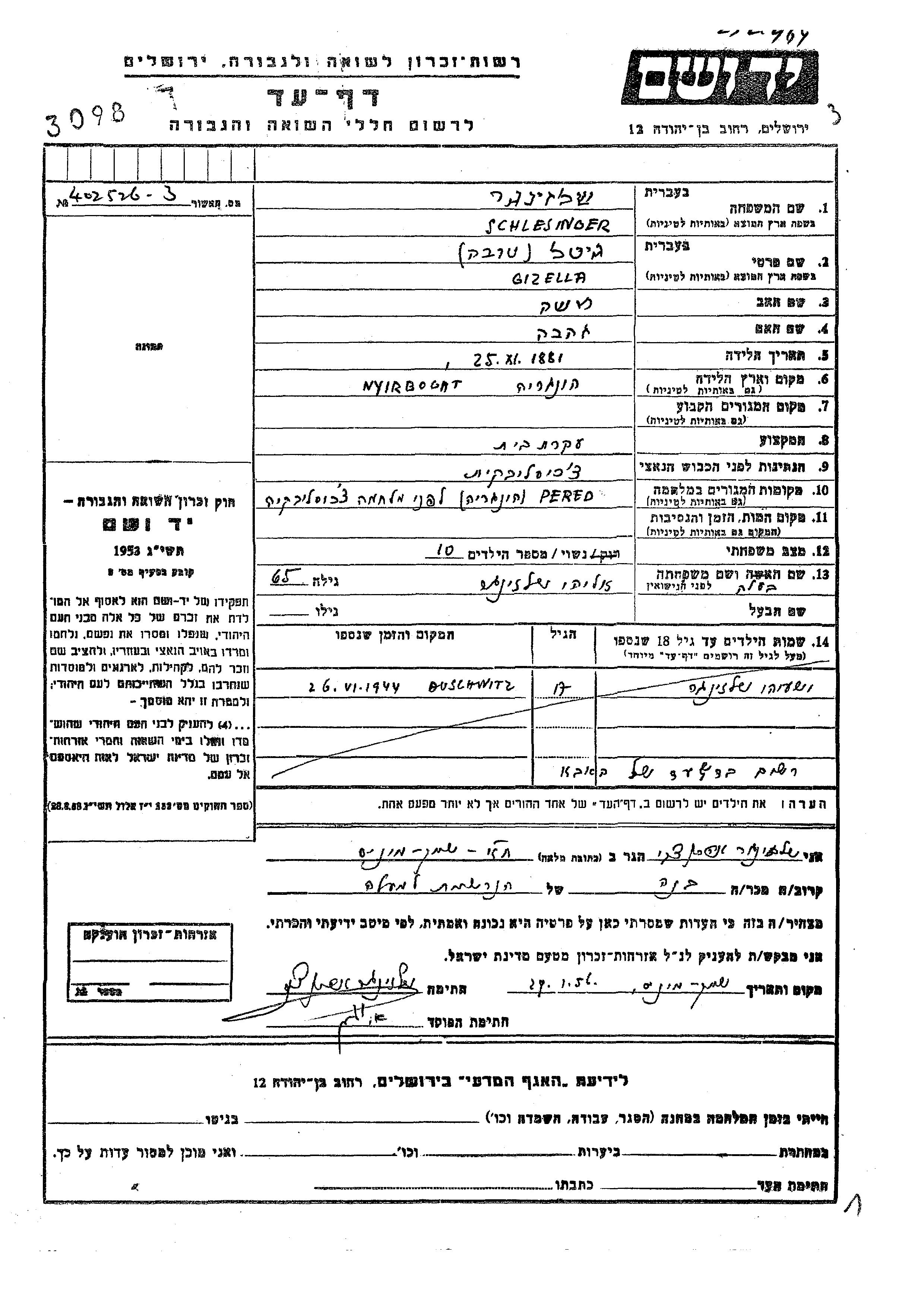 Gizella Gitel Tova Schlesinger est née à Nyirbogat, Hongrie en 1881, fille de Moshe et de Zahava. Elle était Femme au foyer et Mariée à Eliahu. Pendant la guerre, elle était à Pered, Tchécoslovaquie.