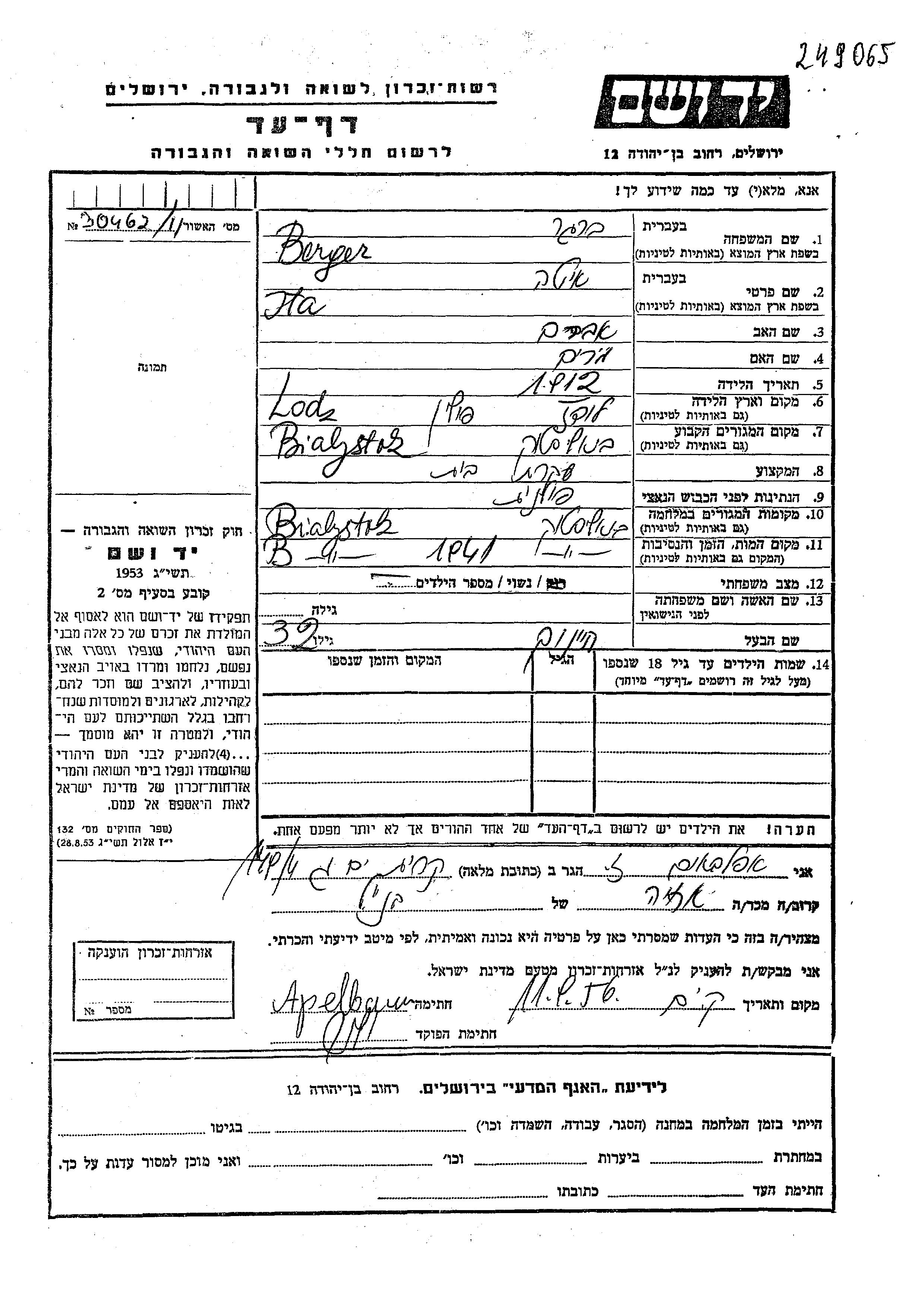 Berger Ita Eta 1912 Bialystok, Pologne Feuille de témoignage