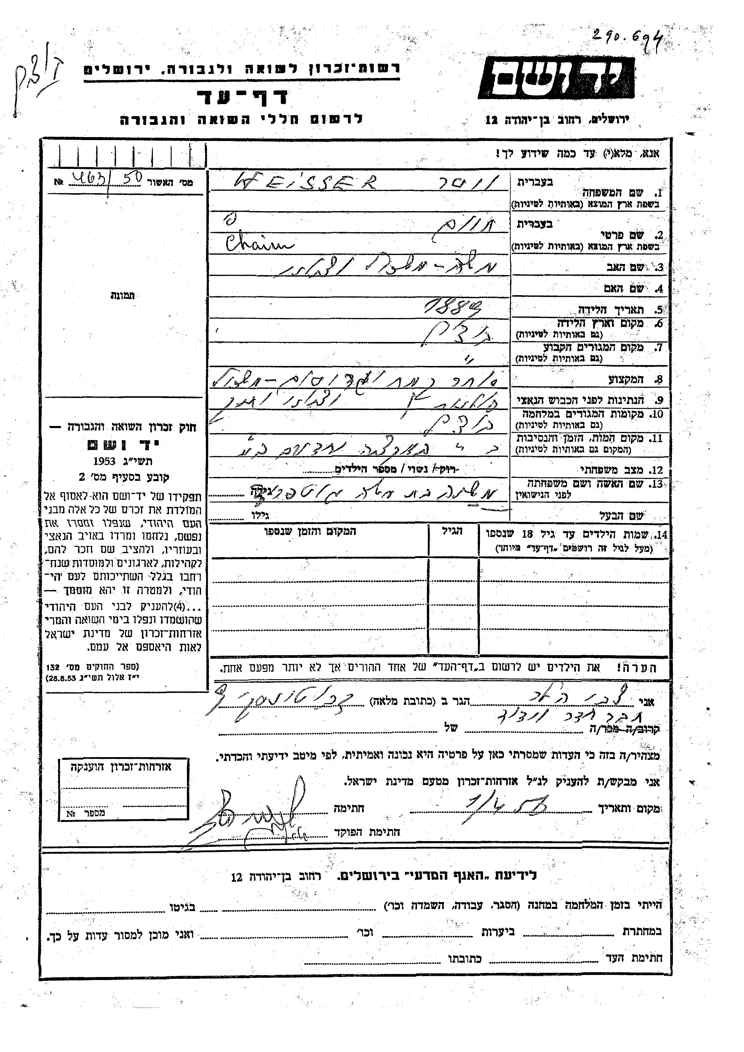 Chaim Weisser est né à Bucac, Pologne en 1889, fils de Moshe. Il était Négociant en farine et Mariée à Menashe née Gotfrid. Avant la seconde guerre mondiale il vivait à Bucac, Pologne. Au cours de la guerre, il était à Bucac, Pologne.