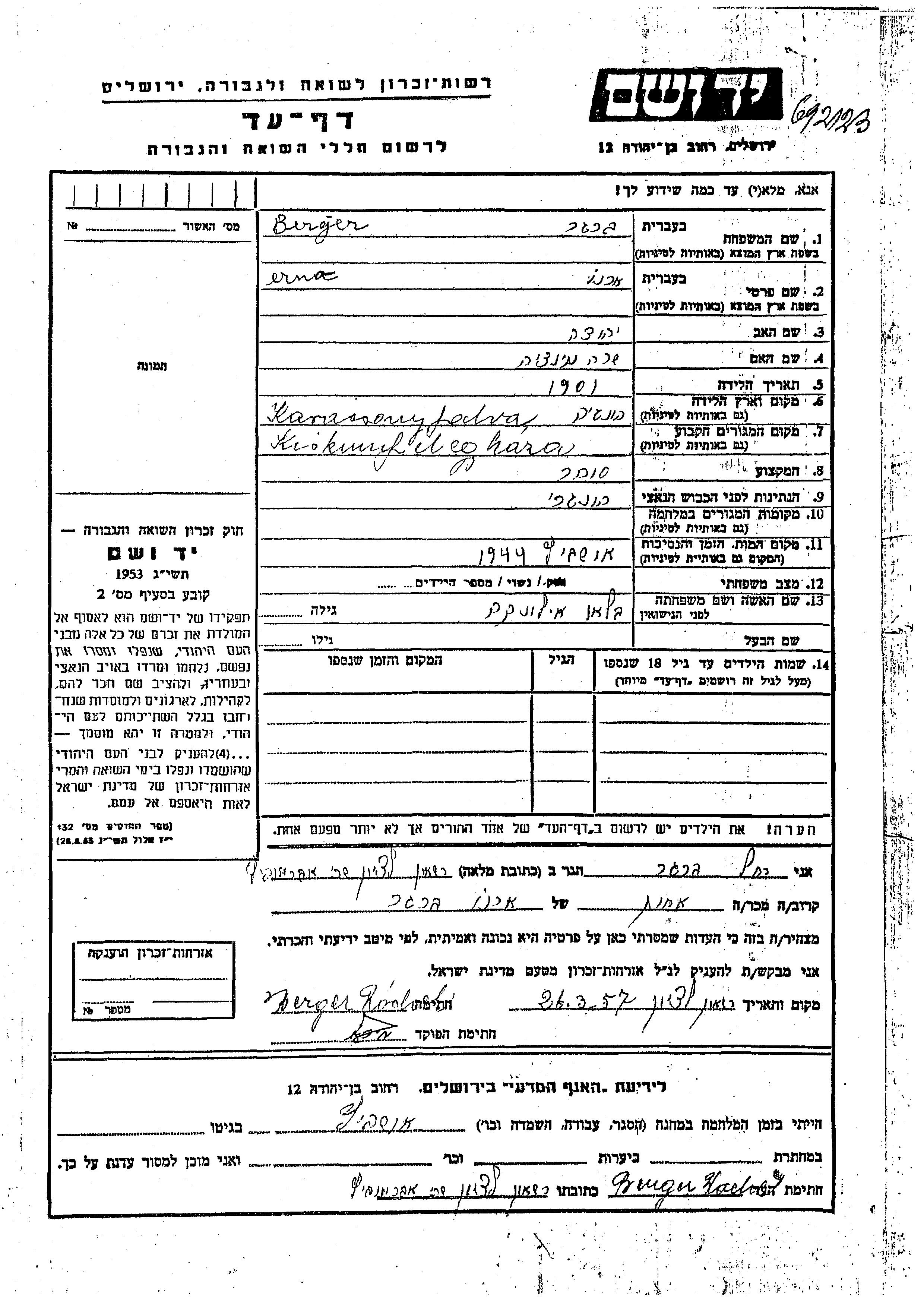 Erno Berger est né à Karacsonyfalva, Roumanie en 1901, fils de Yehuda et de Sara Mina. Il était Commerçant/e et Mariée à Ilona née Blau. Avant la seconde guerre mondiale il vivait à Kiskunfelegyhaza, Hongrie.