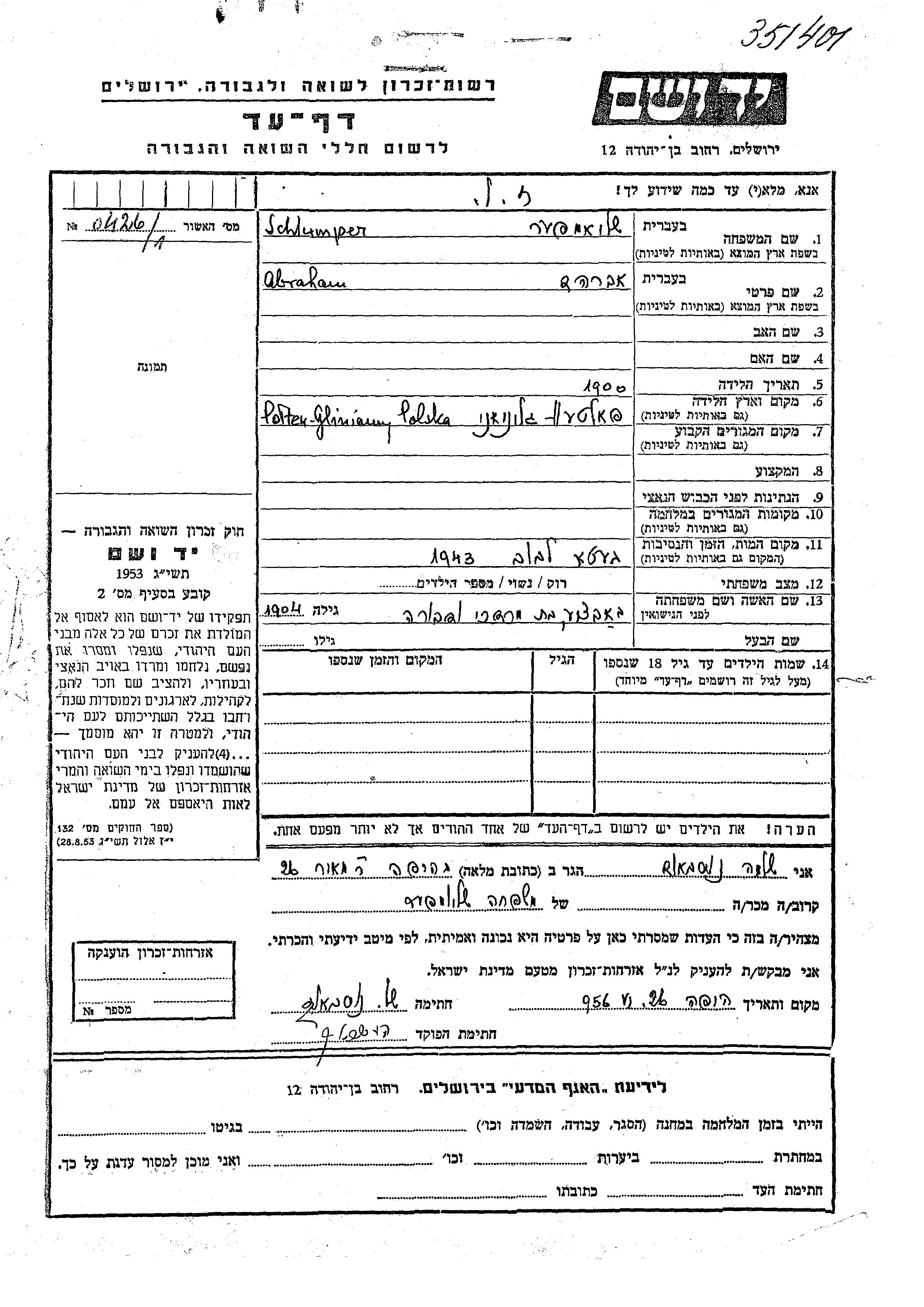 Abraham Schlumper est né à Poltew, Pologne en 1900.