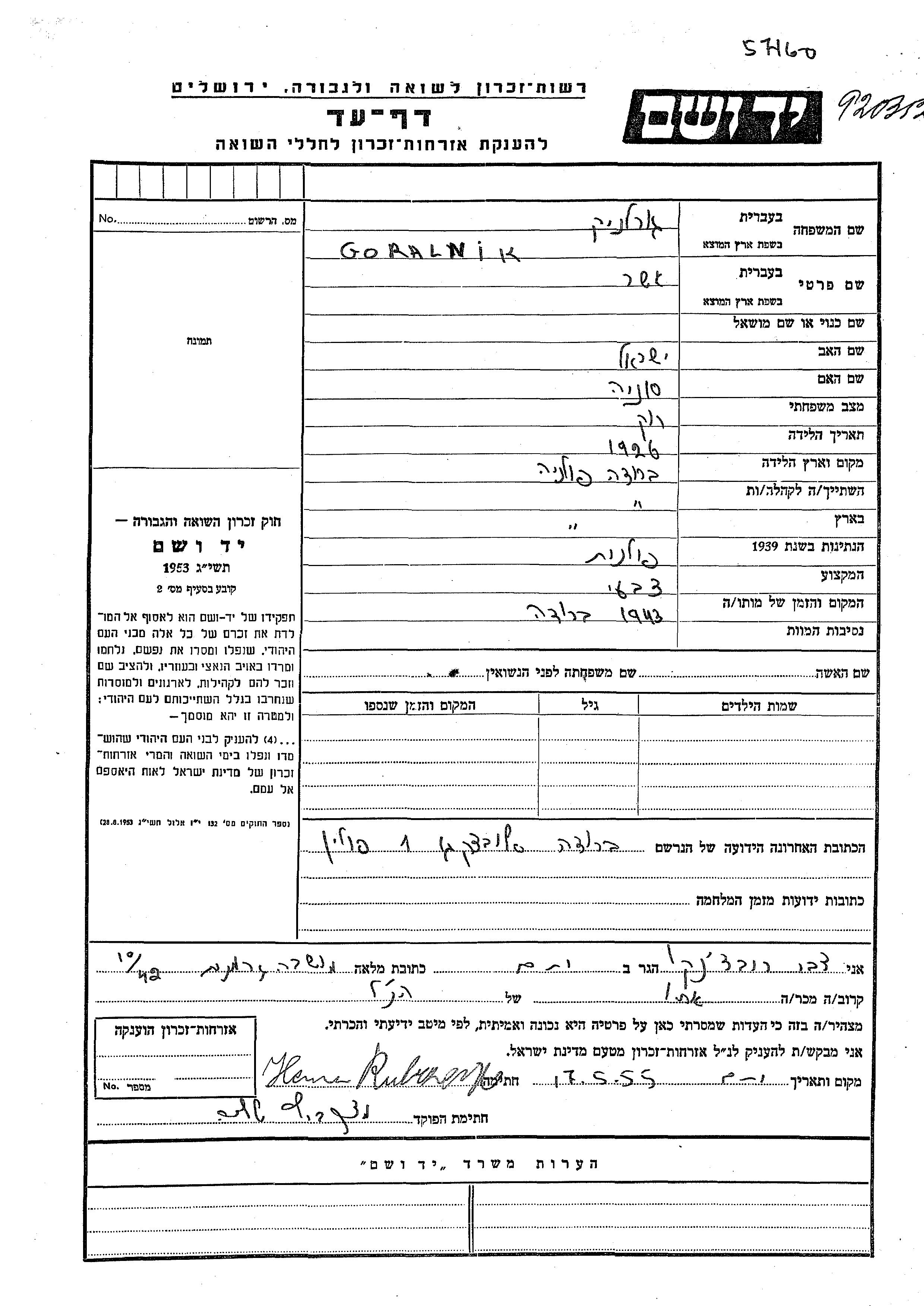 Goralnik Asher 1926 Brody, Pologne Feuille de témoignage