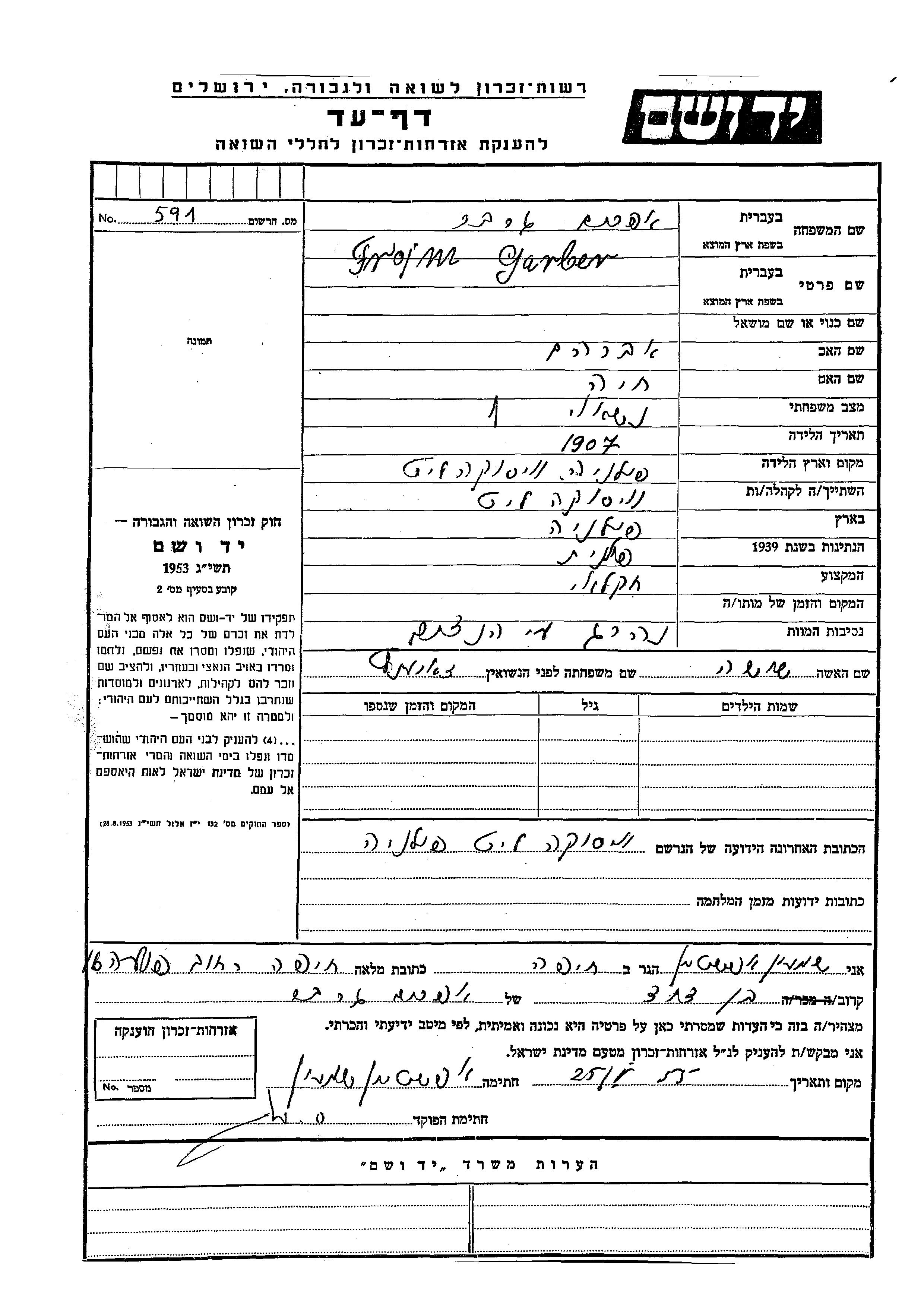 Froim Garbar Graber est né à Wysoka Litowsk, Pologne en 1907, fils de Avraham et de Khaia. Il était Agriculteur et Mariée à Shosha. Avant la seconde guerre mondiale il vivait à Wysoka Litowsk, Pologne.