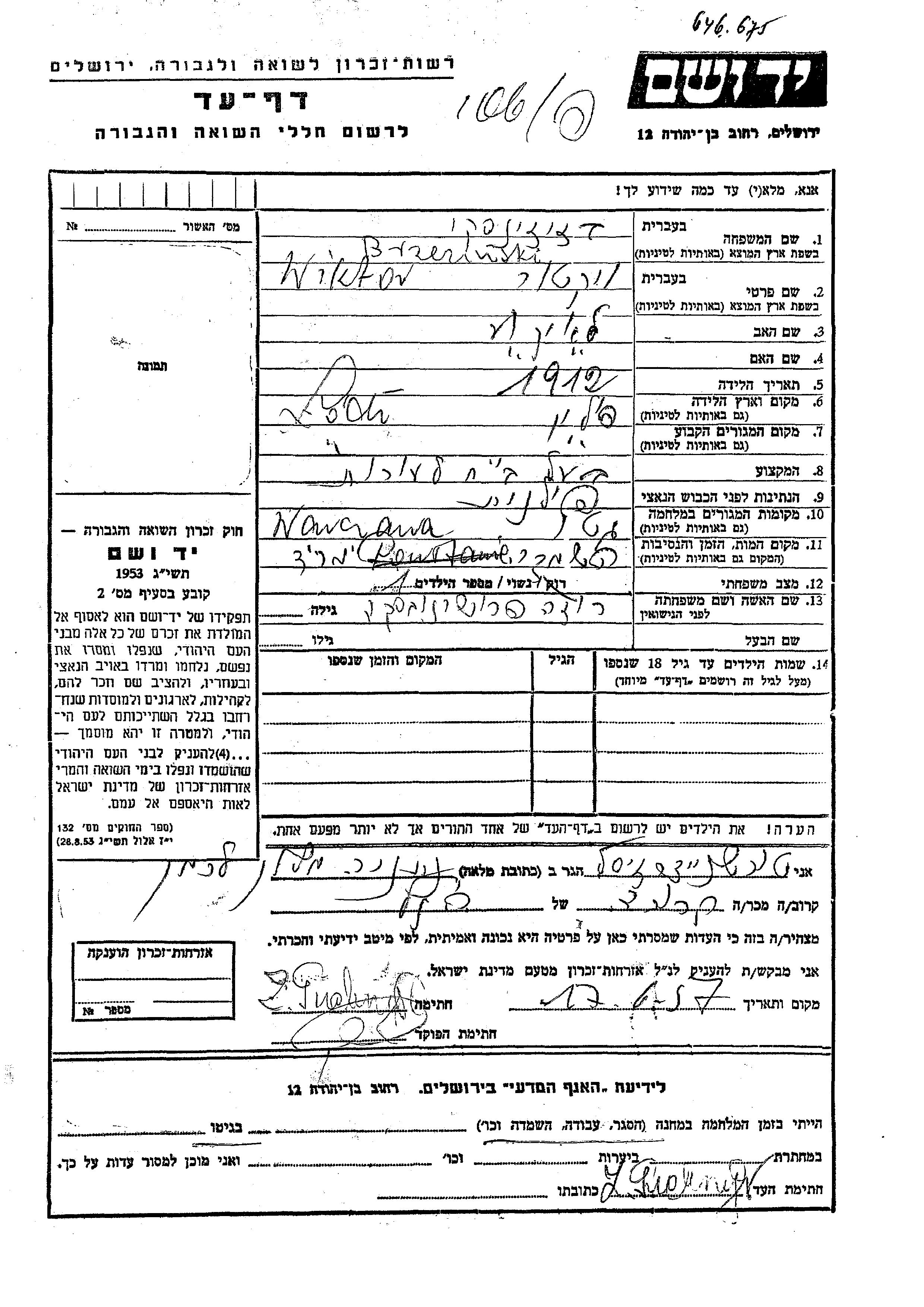 Brzezinski Wiktor 1912 Pologne Feuille de témoignage