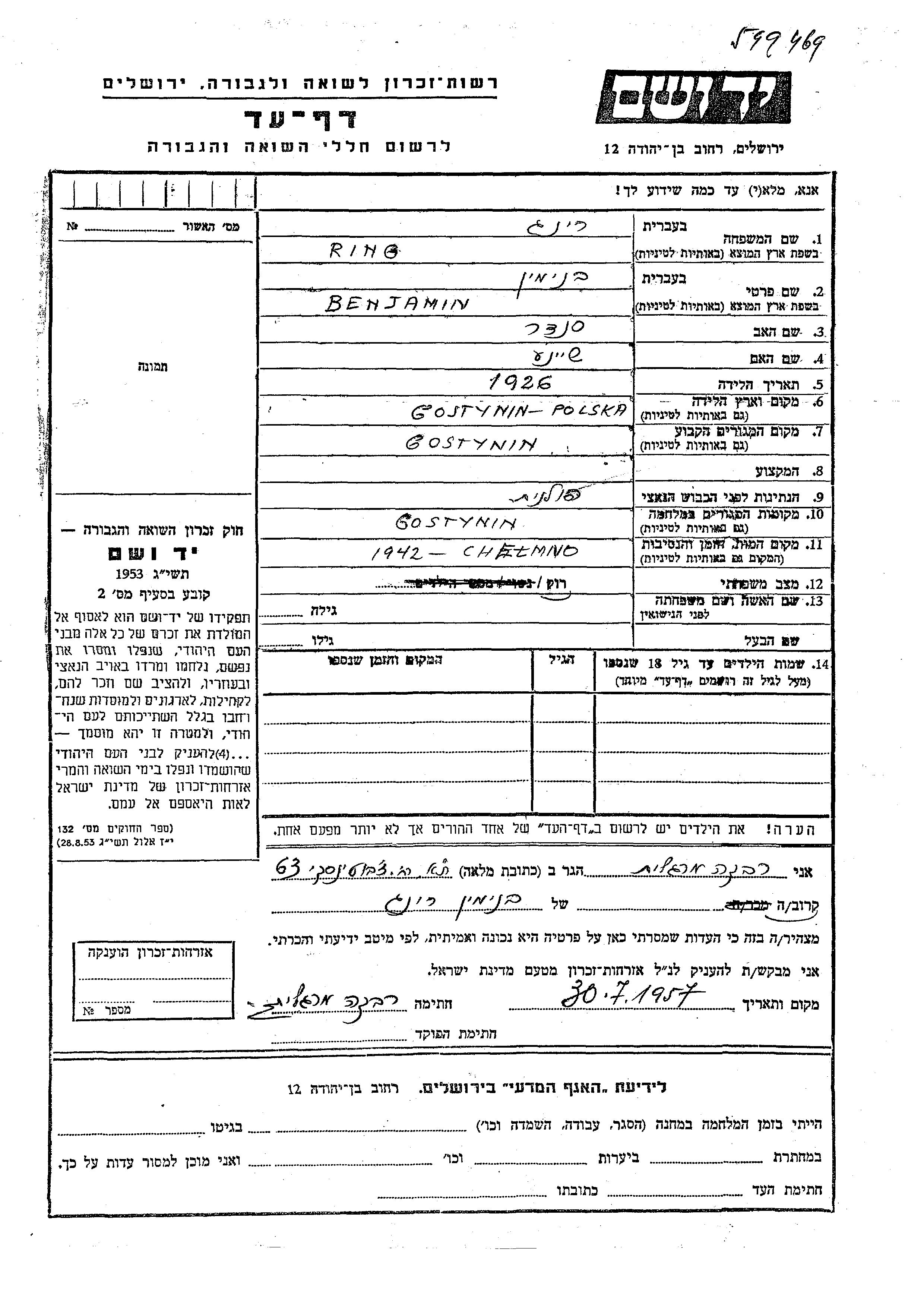 Ring Benjamin 1926 Gostynin, Pologne Feuille de témoignage