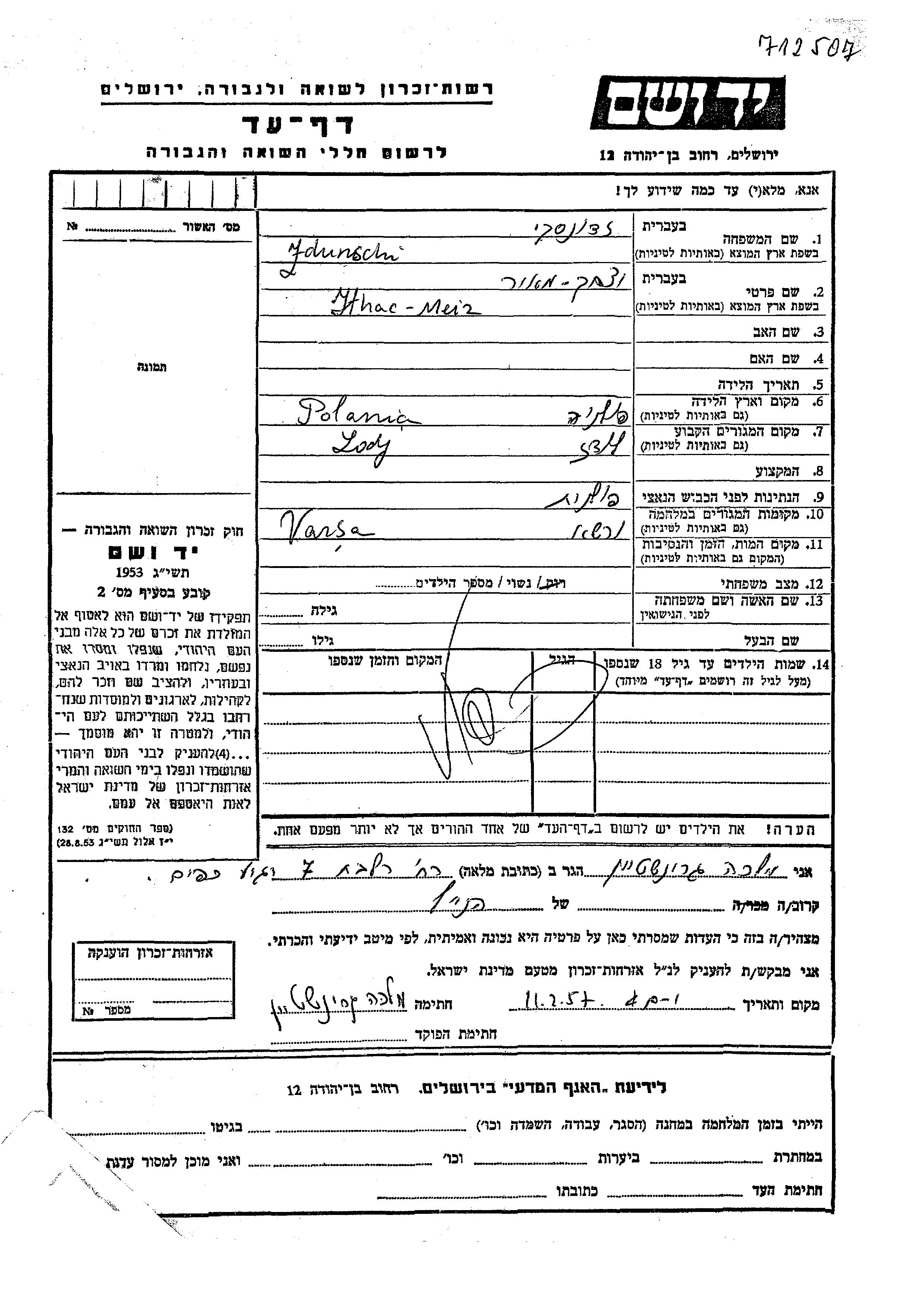 Zdunscki Ythac Meir Lodz, Pologne Feuille de témoignage