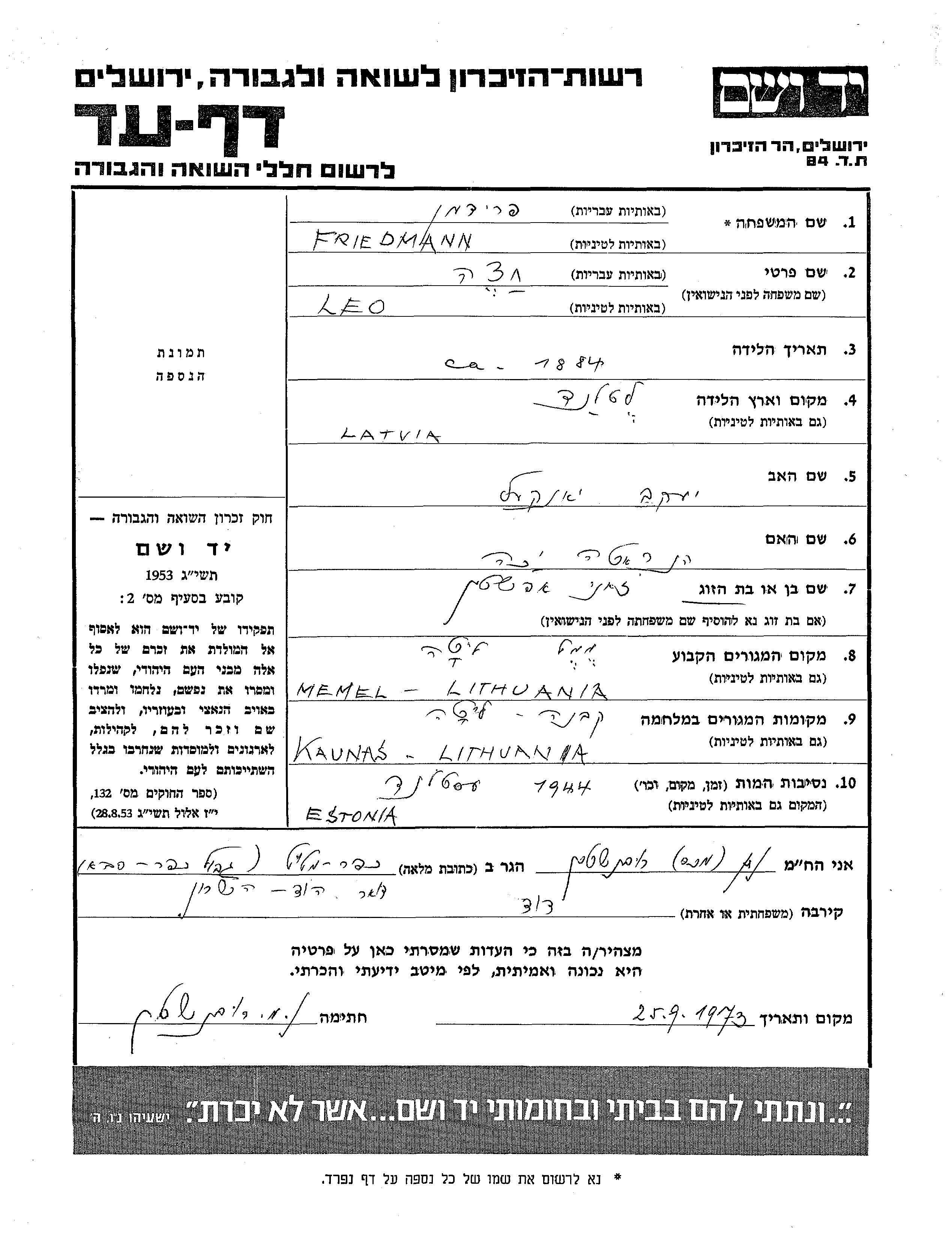 Leo Khatza Friedmann est né à Lettonie en 1884, fils de Yaakov et de Henrieta Iakha. Avant la seconde guerre mondiale il vivait à Memel, Lituanie. Au cours de la guerre, il était à Kaunas, Lituanie.