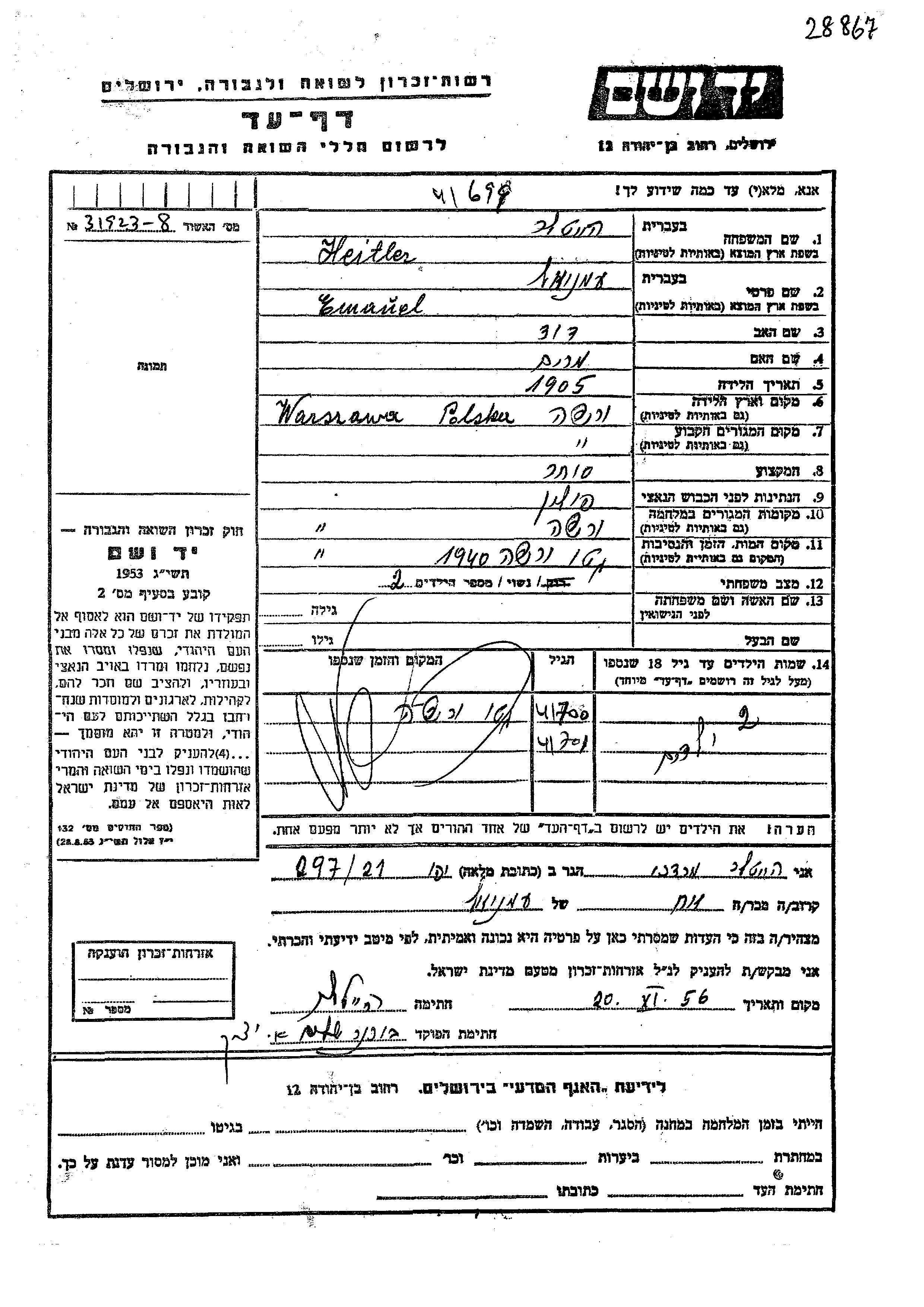 Heitler Emanuel 1905 Warszawa, Pologne Feuille de témoignage