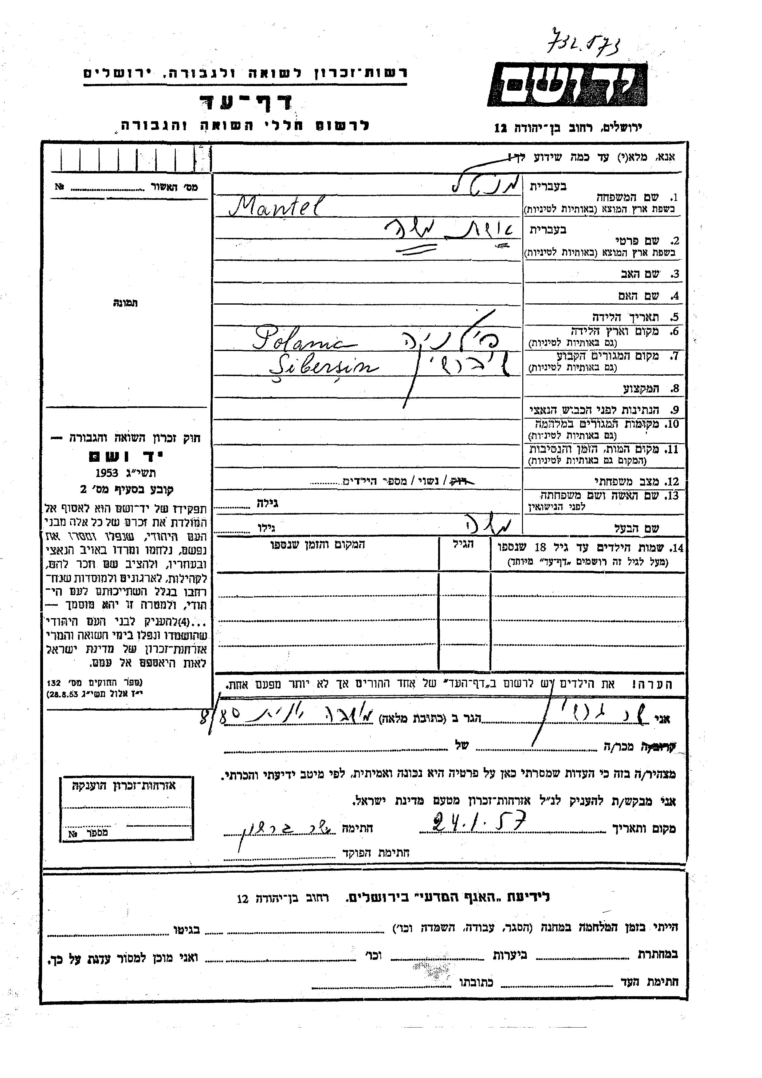 Mantel Mental prénom inconnu Sibersin, Pologne Feuille de témoignage
