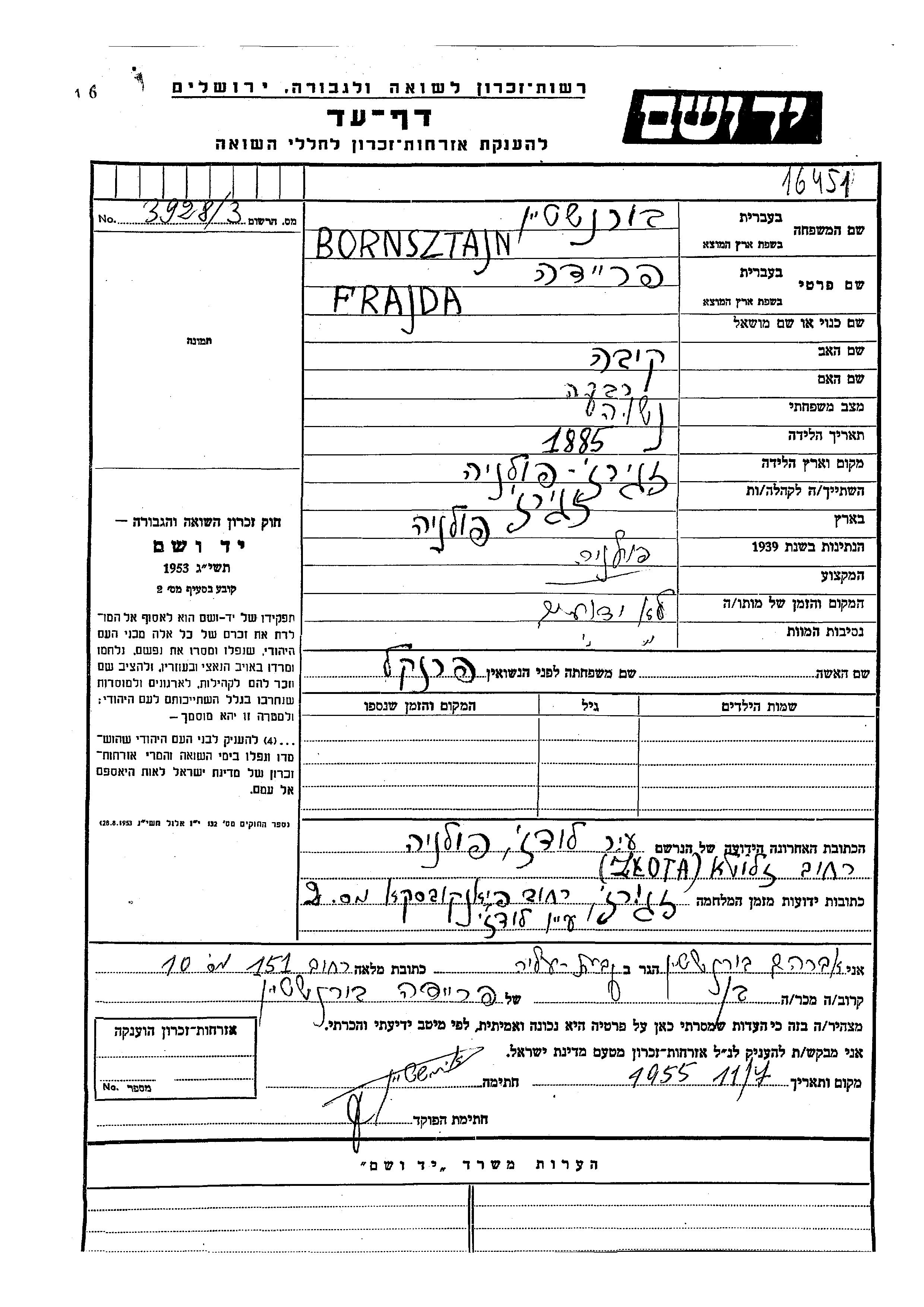 Bornsztajn Frajda Freida 1885 Lodz, Pologne Feuille de témoignage