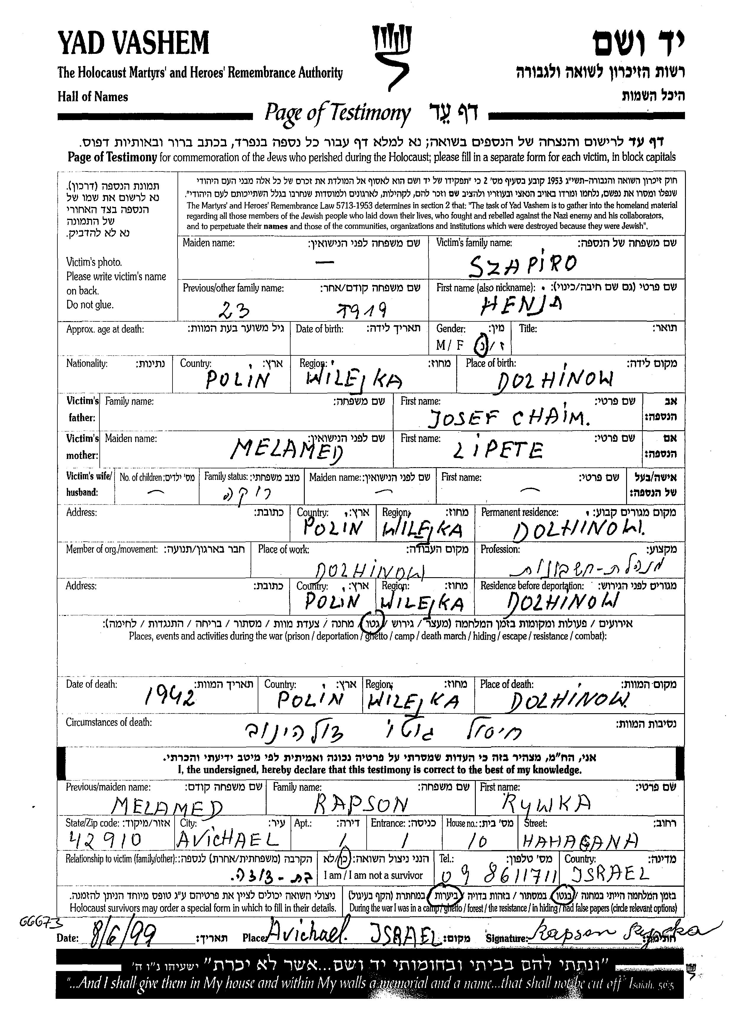 Szapiro | Henja | 1919 | Dolhinow, Pologne | Feuille de témoignage |