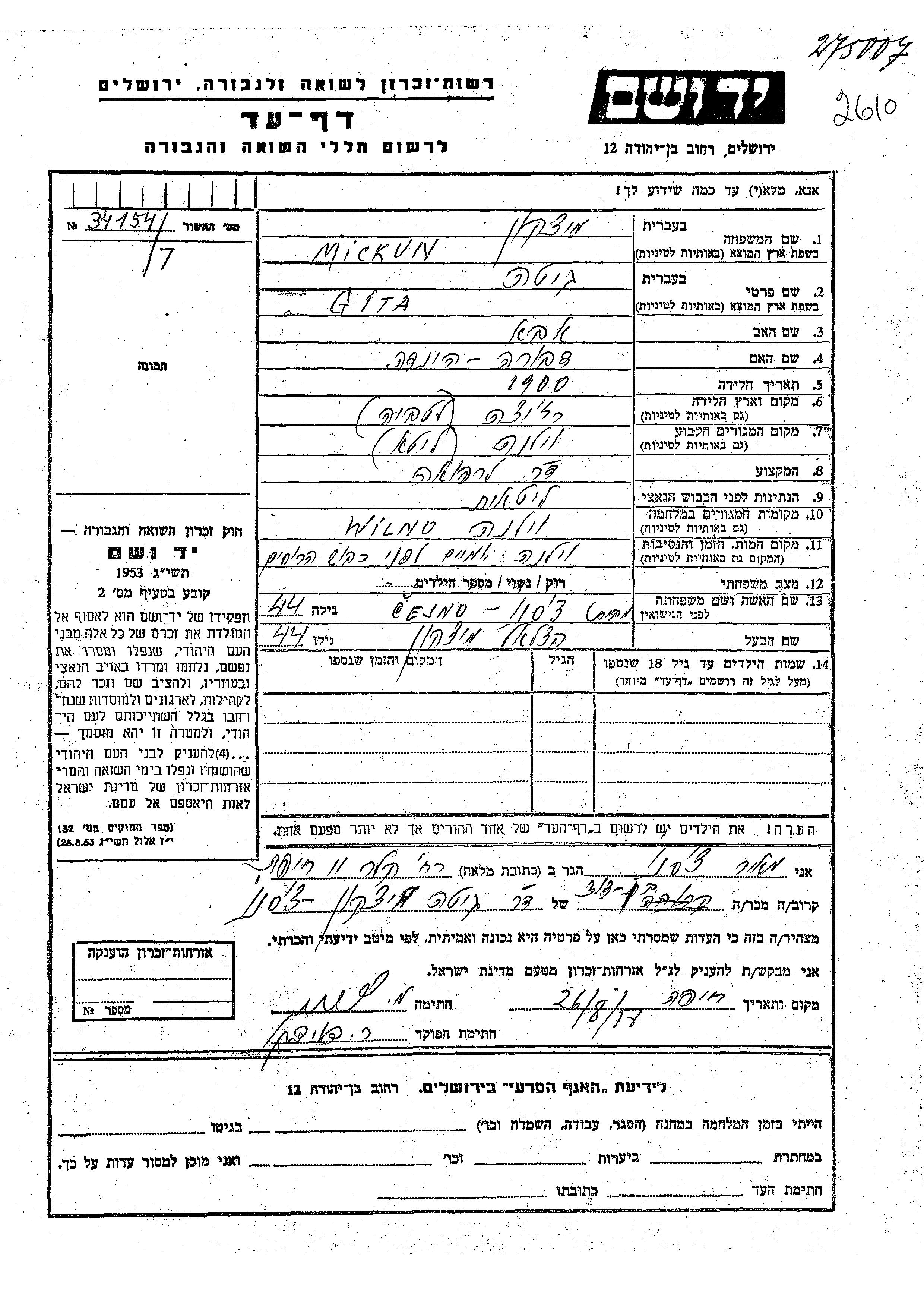 Mickun Gita 1900 Wilno, Pologne Feuille de témoignage