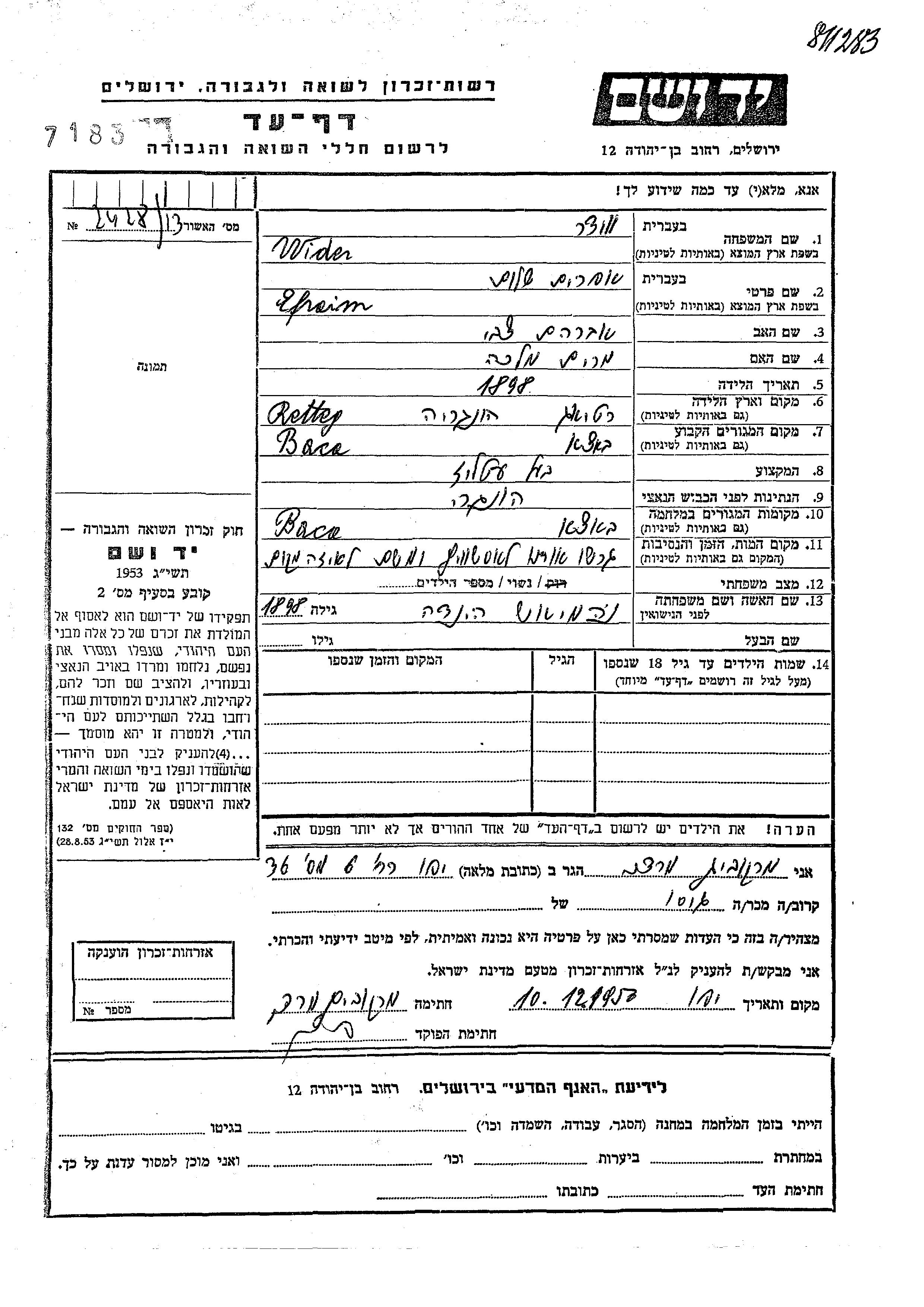 Efraim Shalom Wider est né à Retteg, Roumanie en 1898, fils de Avraham Tzvi et de Miriam Malka. Il était Propriétaire d'une boucherie et Mariée à Hinda née Nakhemia. Avant la seconde guerre mondiale il vivait à Bacsa, Hongrie. Au cours de la guerre, il était à Bacsa, Hongrie.