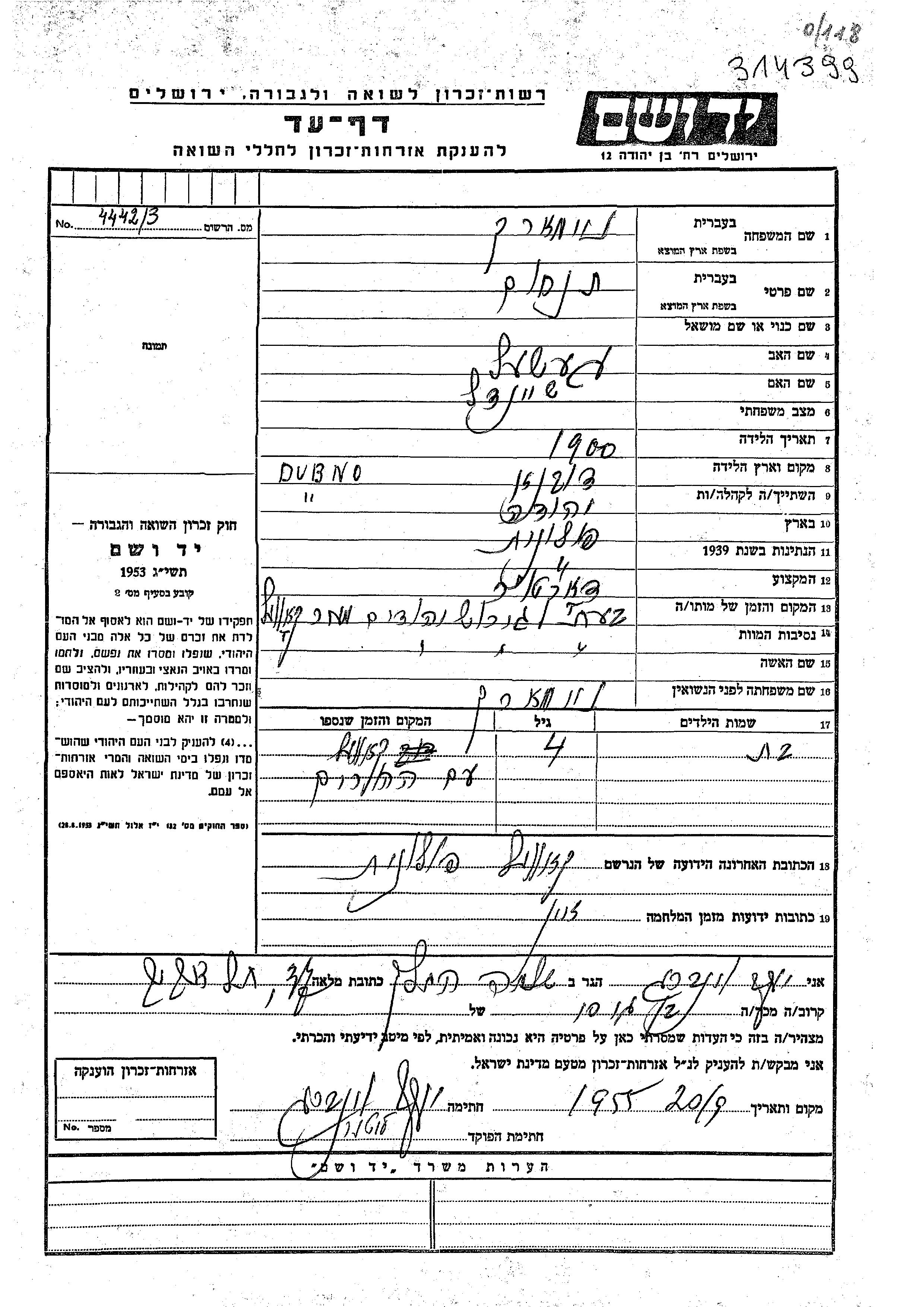 Naimark Tankhum 1900 Dubno, Pologne Feuille de témoignage