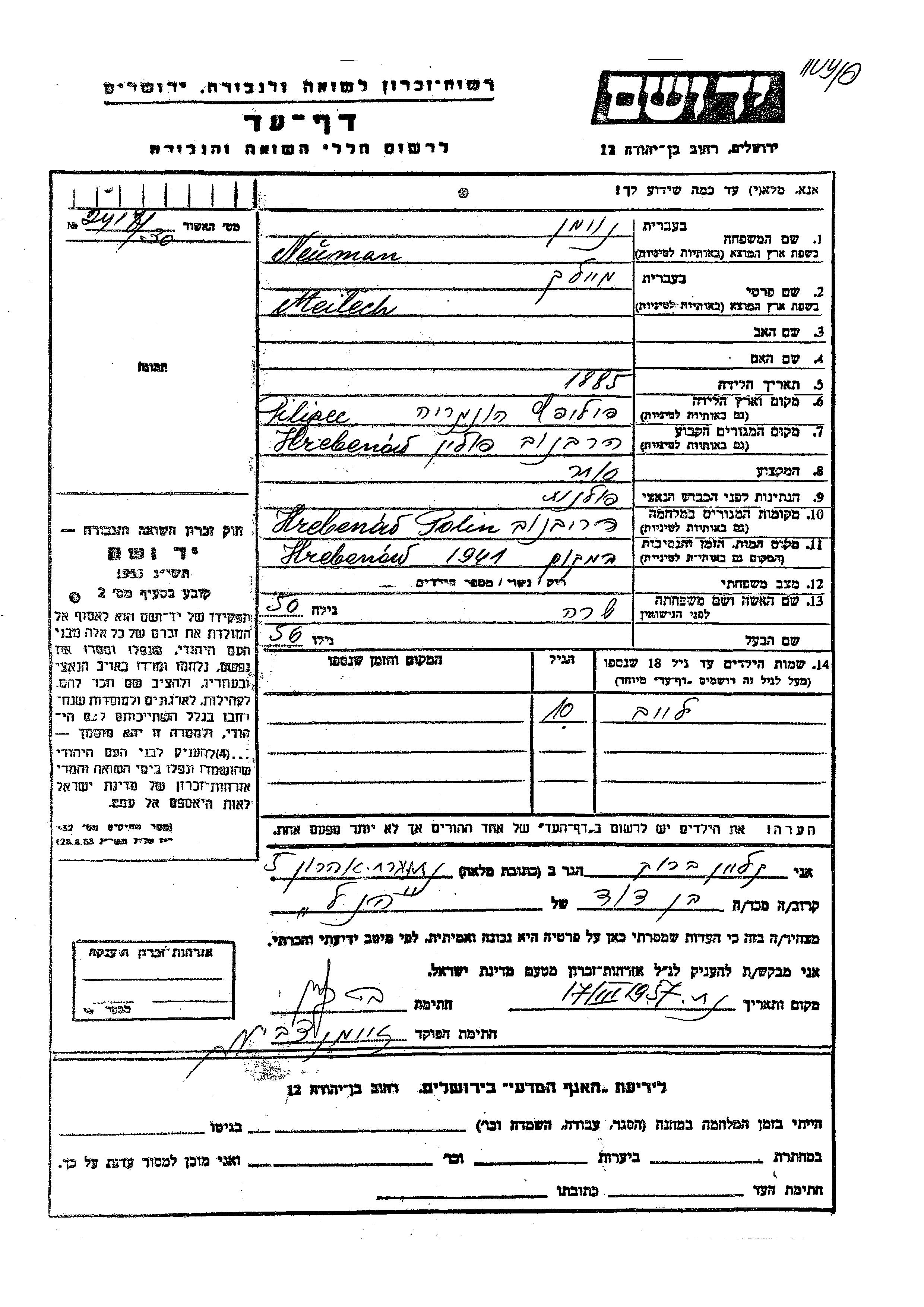 Neuman Meilech 1885 Hrebenów, Pologne Feuille de témoignage