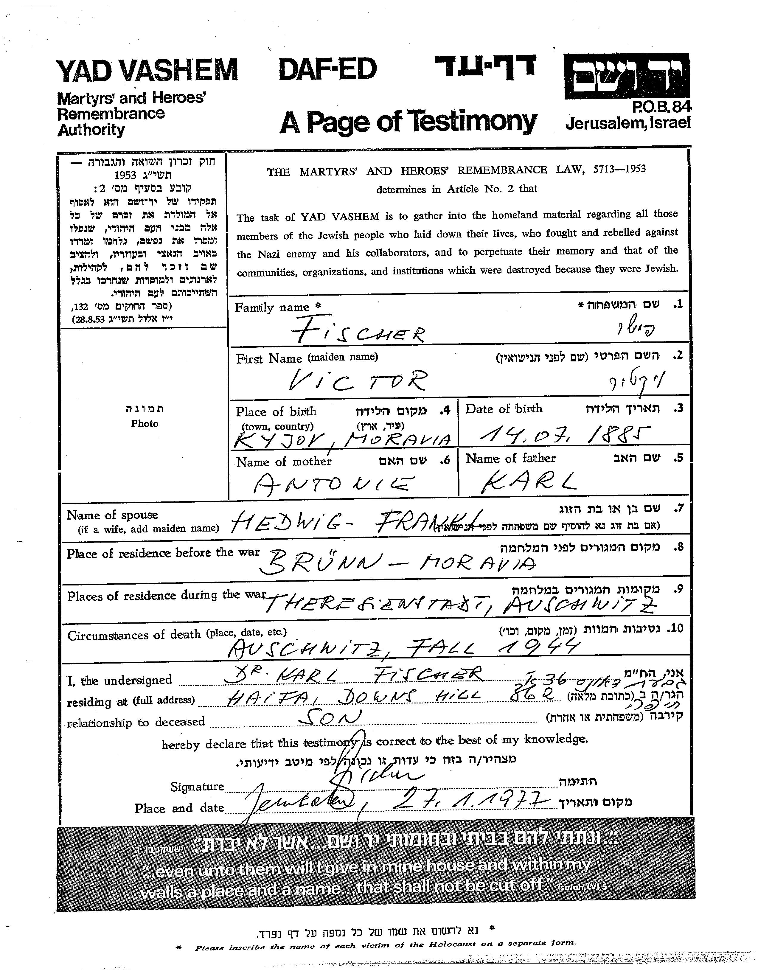 Victor Fischer est né à Kyjov, Tchécoslovaquie en 1885, fils de Karl et de Antonie. Il était Mariée à Hedwig née Frankl. Avant la seconde guerre mondiale il vivait à Brunn, Tchécoslovaquie. Au cours de la guerre, il était à Auschwitz, Pologne.