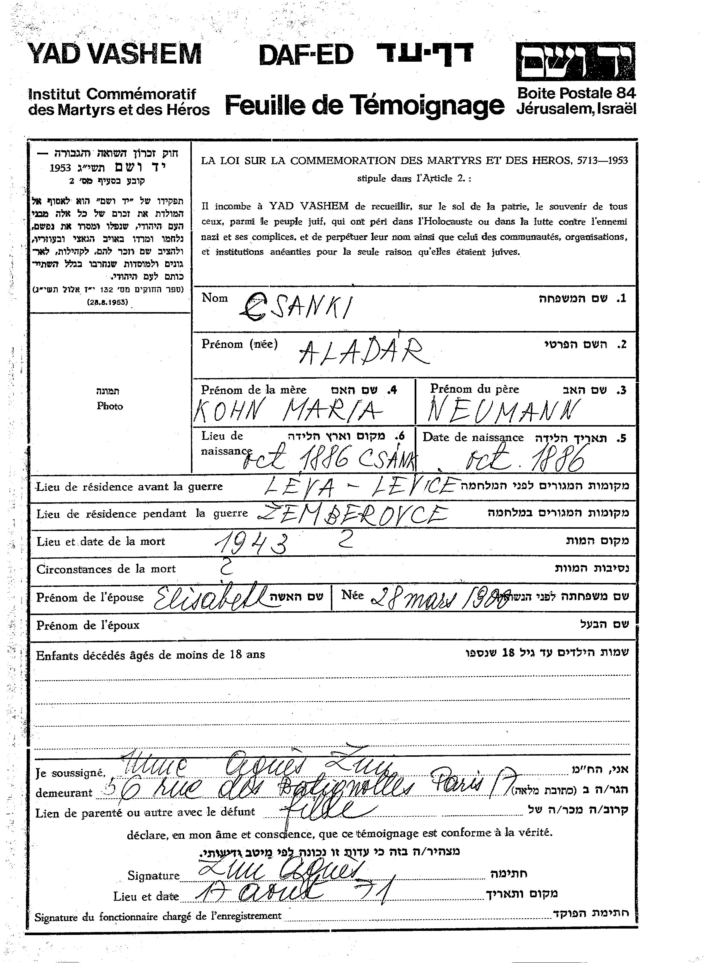 Csanki Aladar 1886 Levice, Tchécoslovaquie Feuille de témoignage