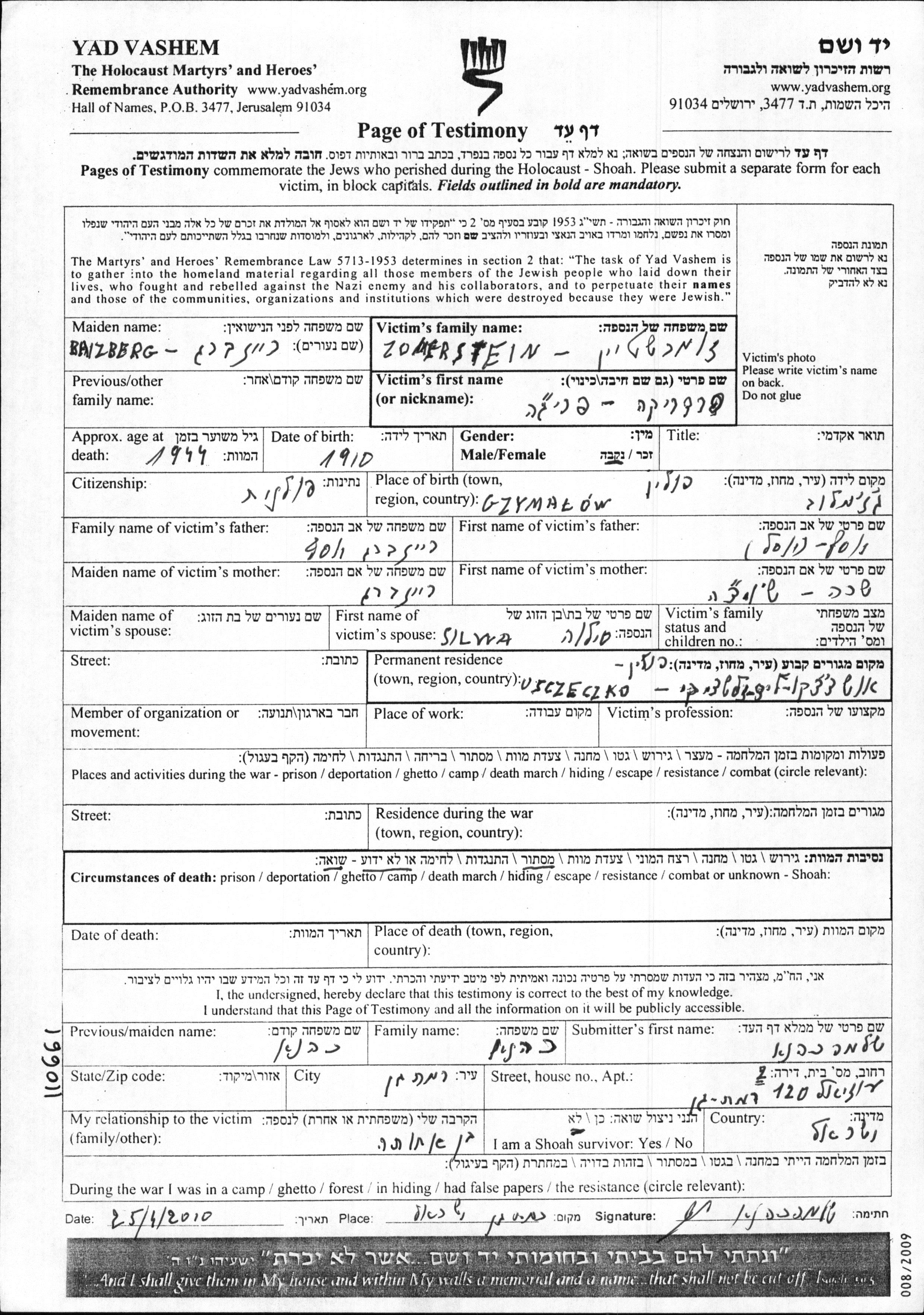 Yad Vashem - Pages of Testimony Names Memorial Collection