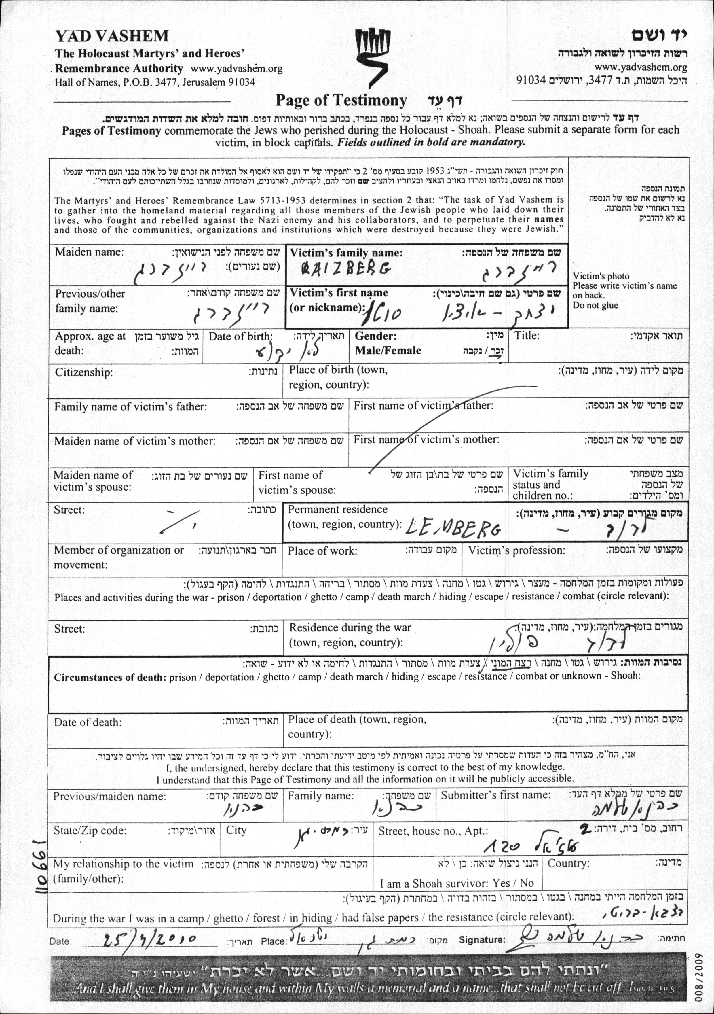 Raizberg Yitzkhak Lemberg, Pologne Feuille de témoignage