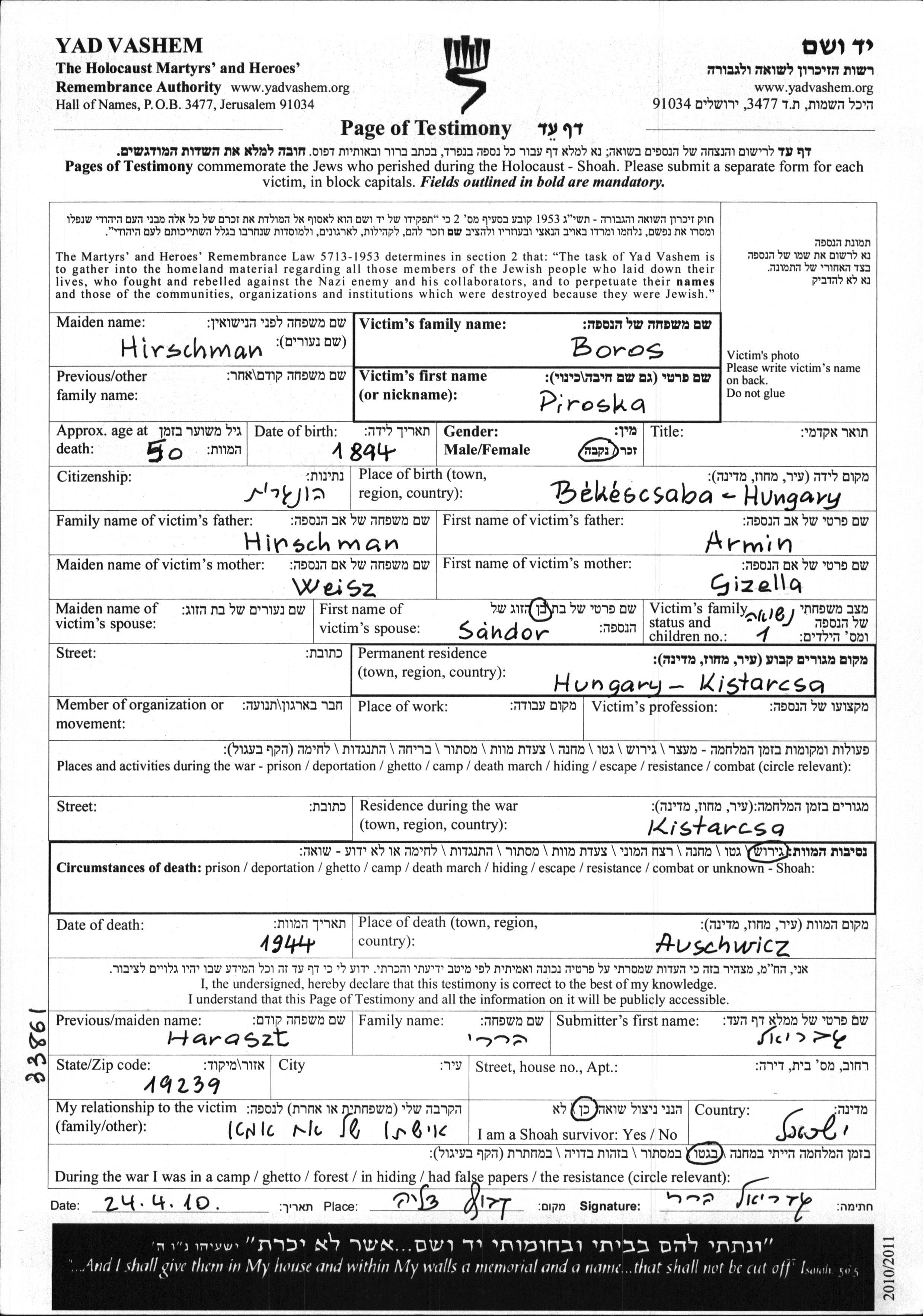 Piroska a été assassinée pendant la Shoah. Lieu de la mort: Auschwitz, Pologne en 1944.