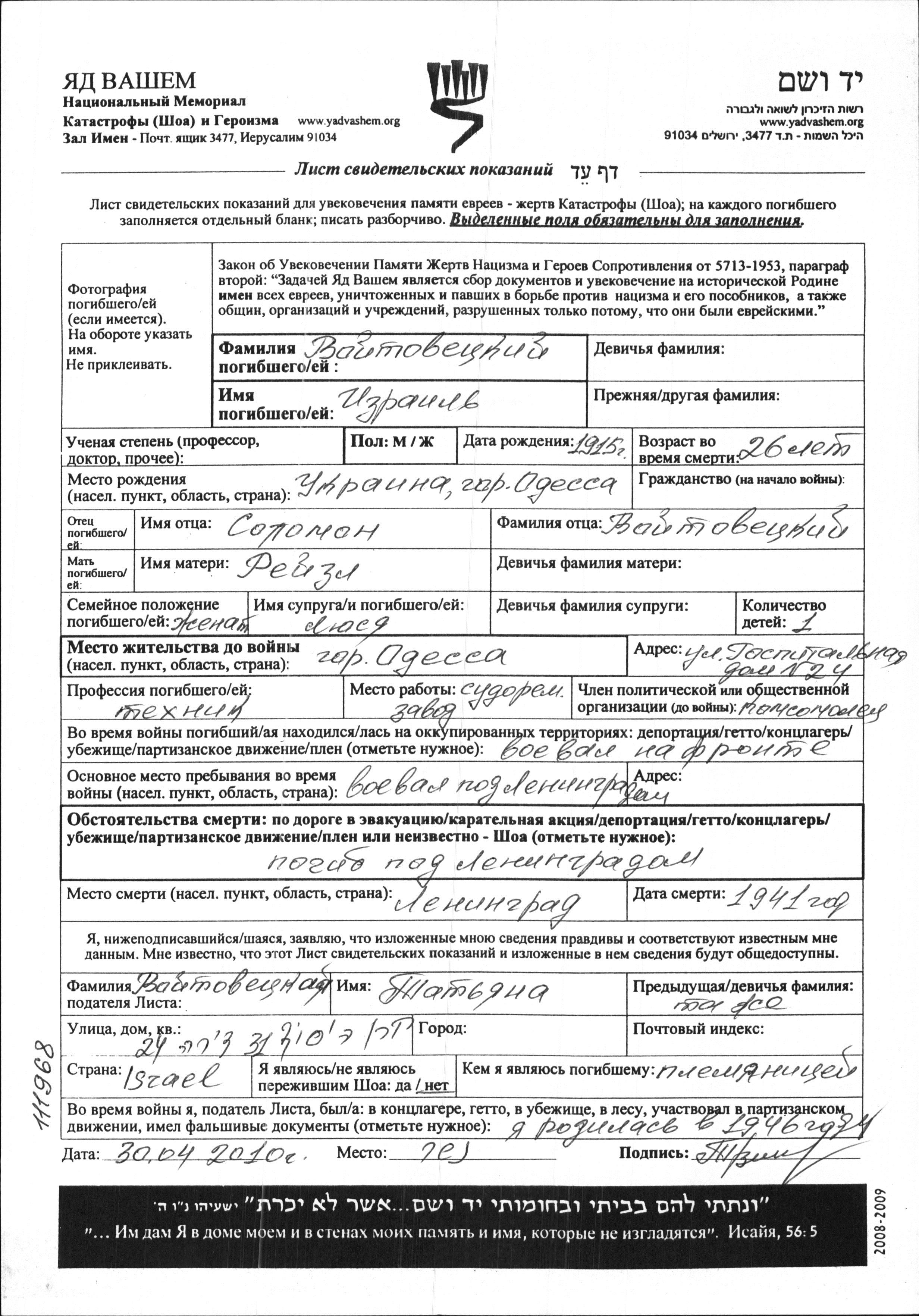 Izrail Voitovetzki est né à Odessa, Ukraine (URSS) en 1915, fils de Solomon et de Reyzl. Il était Téchnicien et Mariée à Lyusya. Avant la seconde guerre mondiale il vivait à Odessa, Ukraine (URSS). Au cours de la guerre, il était à the Soviet armed forces. Izrail a été tué en tant que militaire pendant la Seconde Guerre mondiale. Lieu de la mort: Leningrad City, Russie (URSS) en 1941.