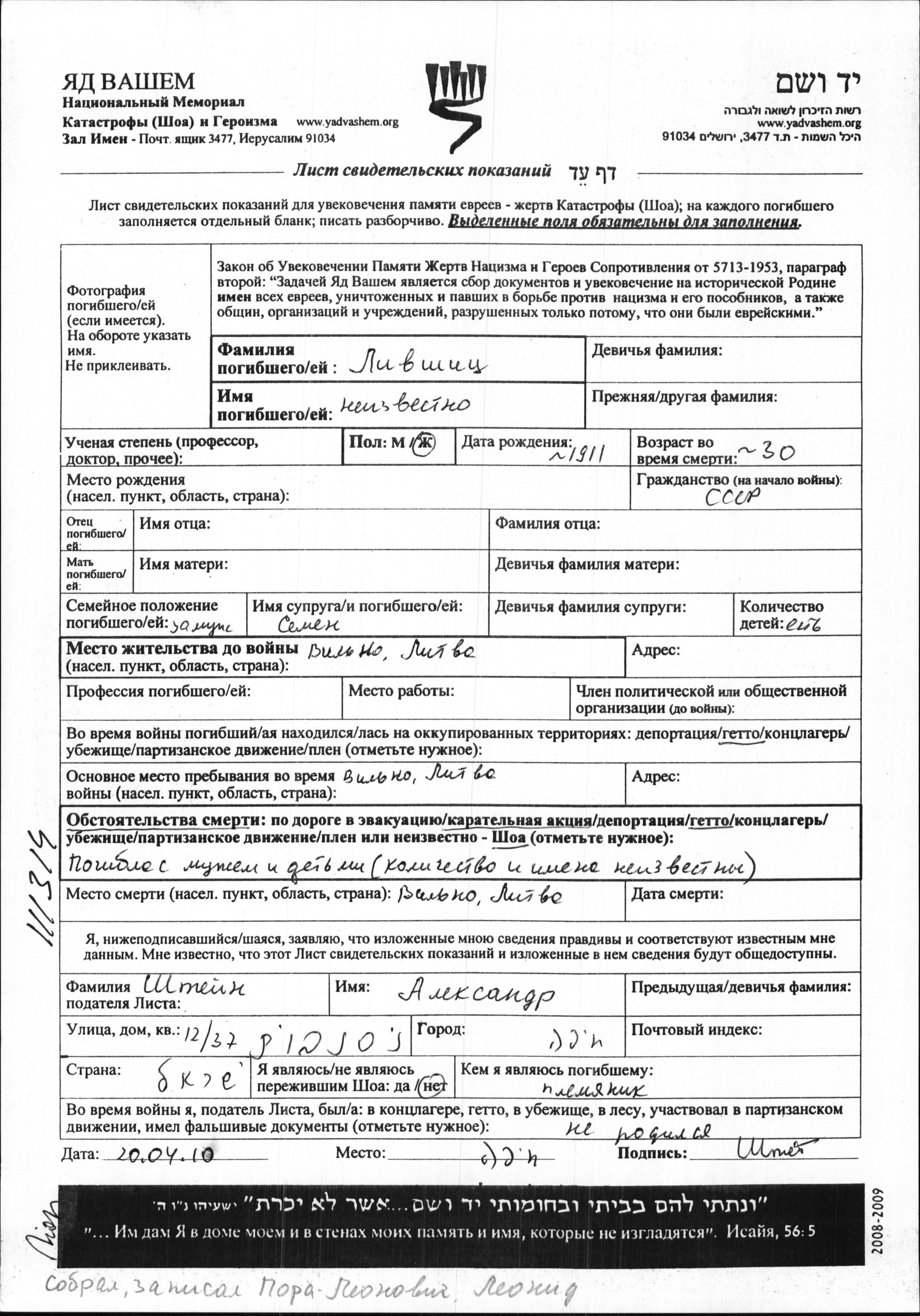 Livshitz prénom inconnu 1911 Wilno, Pologne Feuille de témoignage