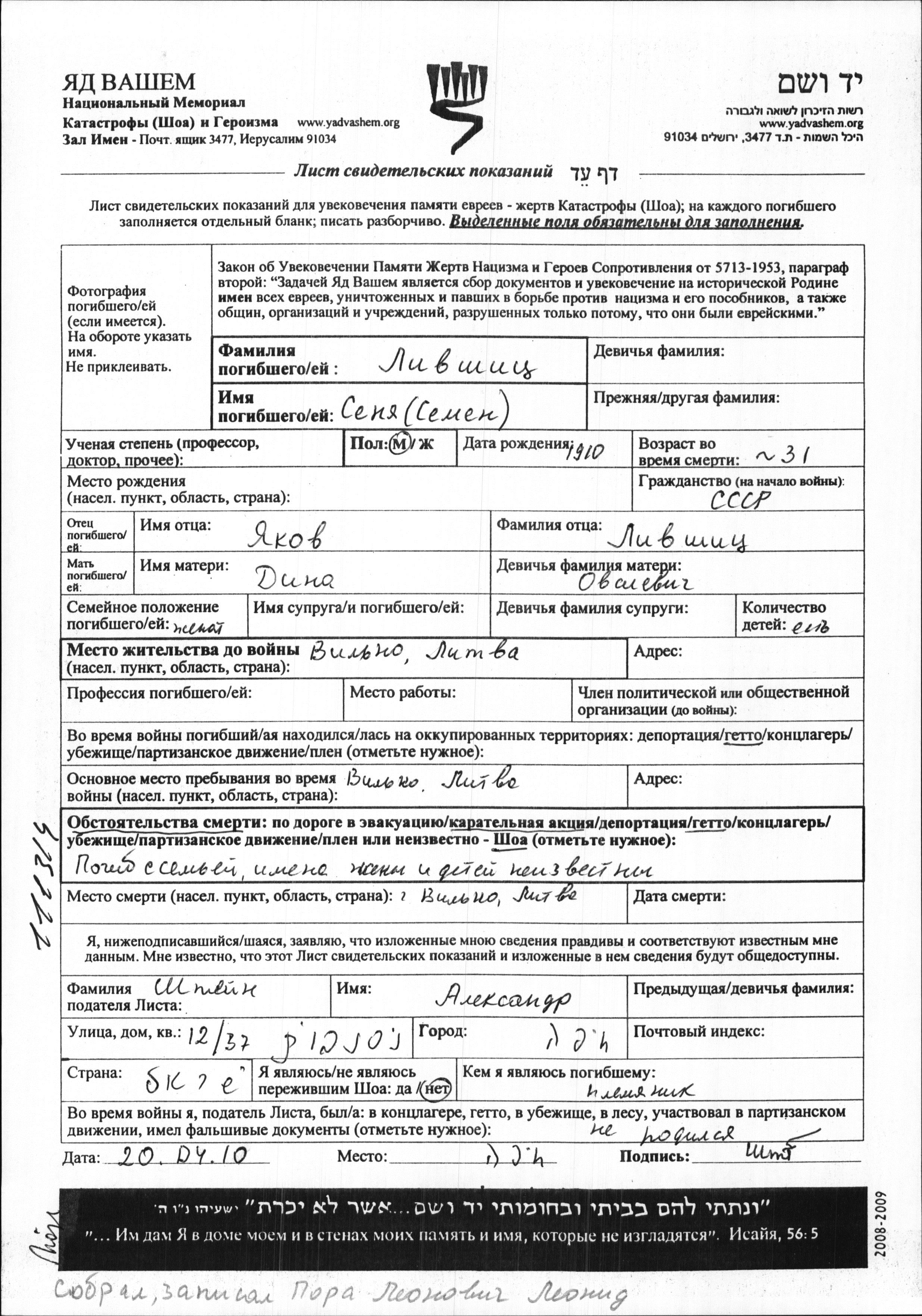 Livshitz Senya 1910 Wilno, Pologne Feuille de témoignage