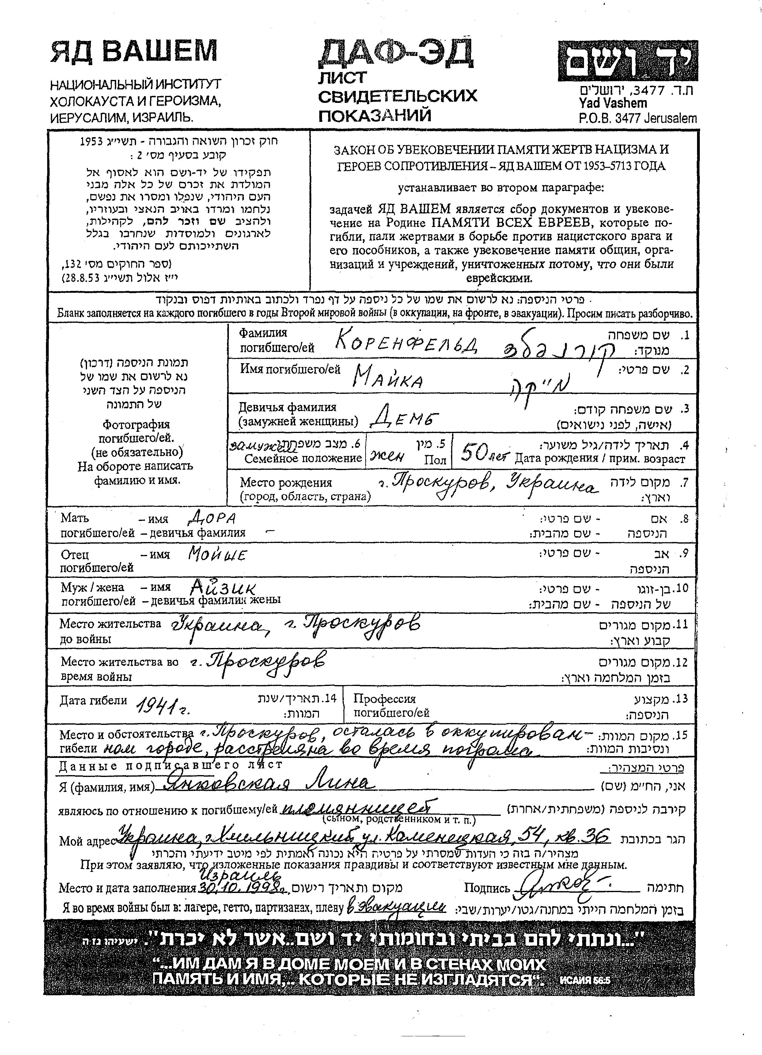 Korenfeld Maika Proskurov, Ukraine (URSS) Feuille de témoignage