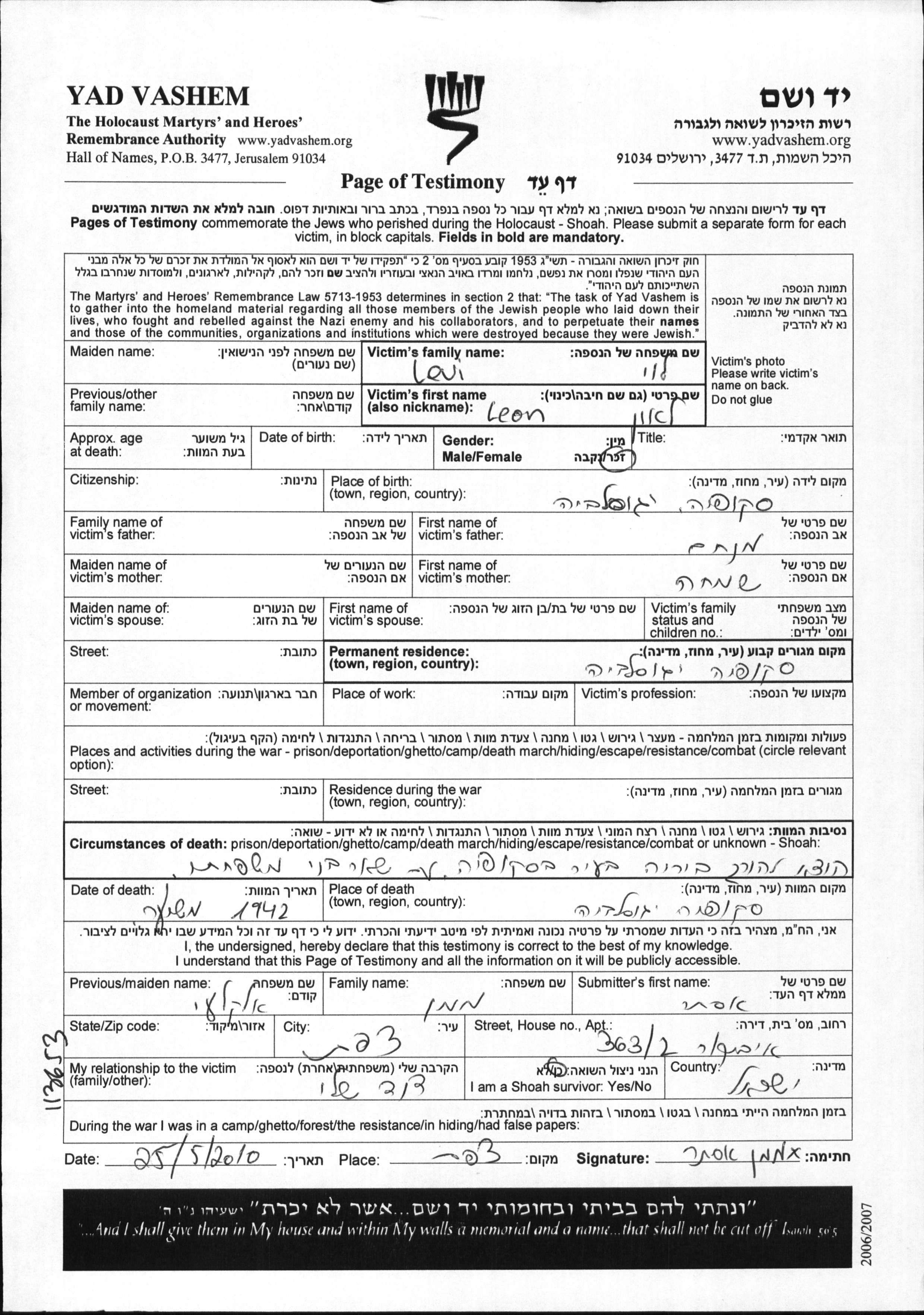 Yad Vashem - Pages of Testimony Names Memorial Collection