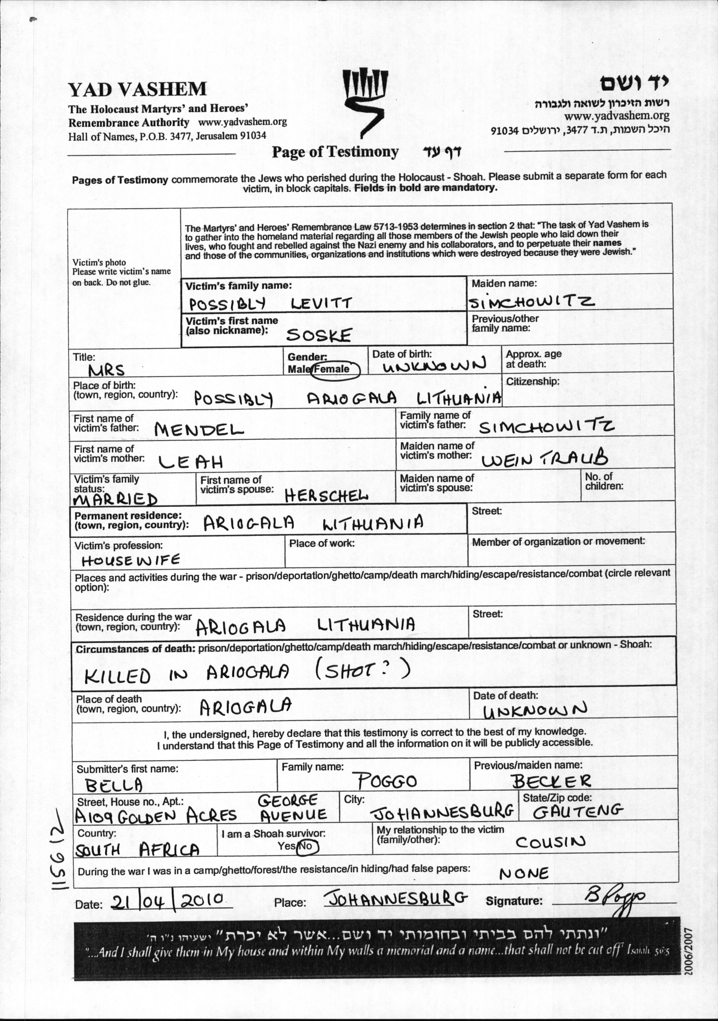 Soske Levitt née Simchowitz est née à Ariogala, Lituanie, fille de Mendel et de Leah née Weintraub. Elle était Femme au foyer et Mariée à Herschel. Avant la seconde guerre mondiale elle vivait à Ariogala, Lituanie. Pendant la guerre, elle était à Ariogala, Lituanie.