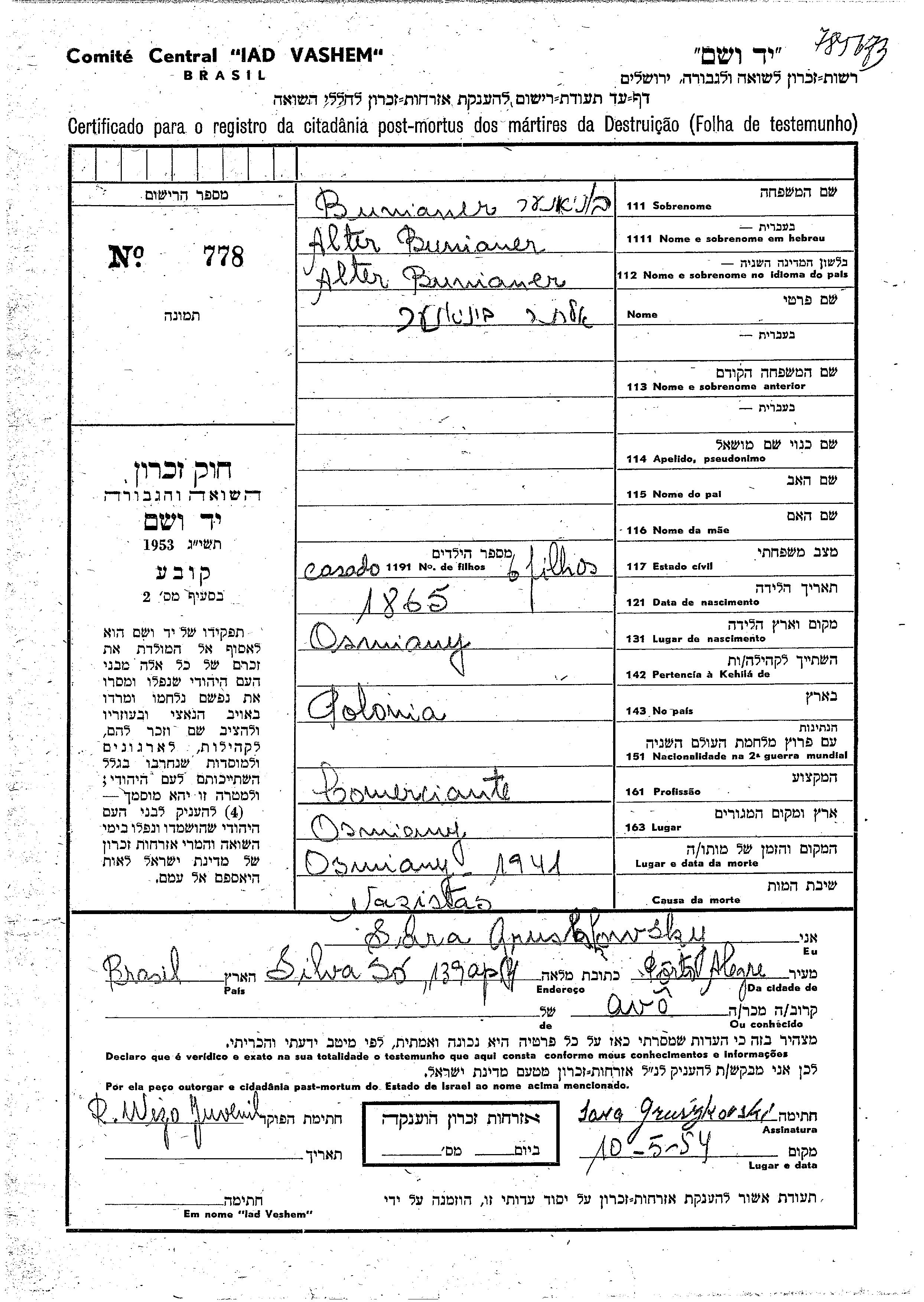 Alter Bunianer est né à Osmiany, Pologne en 1865. Il était Commerçant/e et Marié. Avant la seconde guerre mondiale il vivait à Osmiany, Pologne. Au cours de la guerre, il était à Osmiany, Pologne.