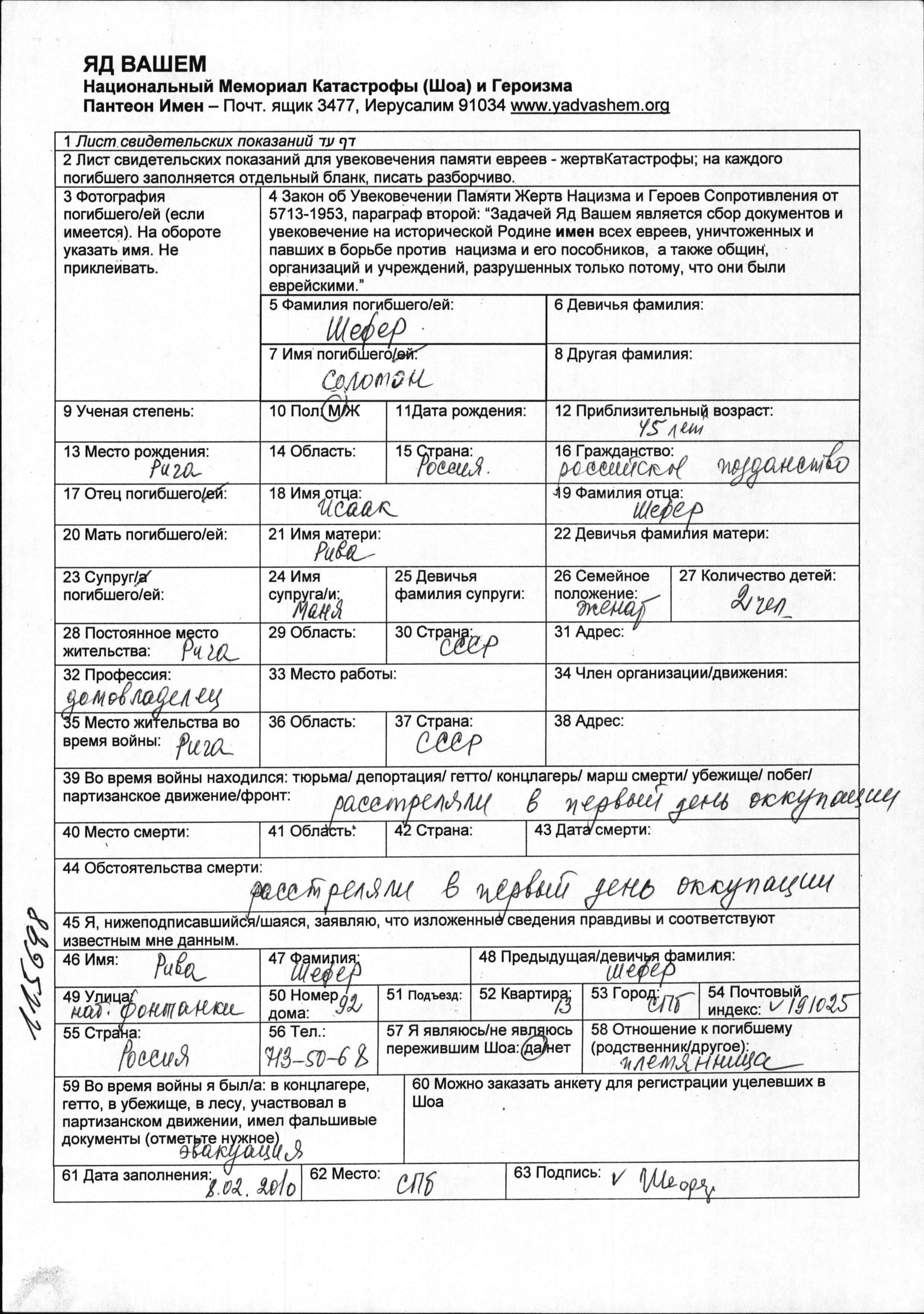 Shefer Solomon Riga, Lettonie Feuille de témoignage