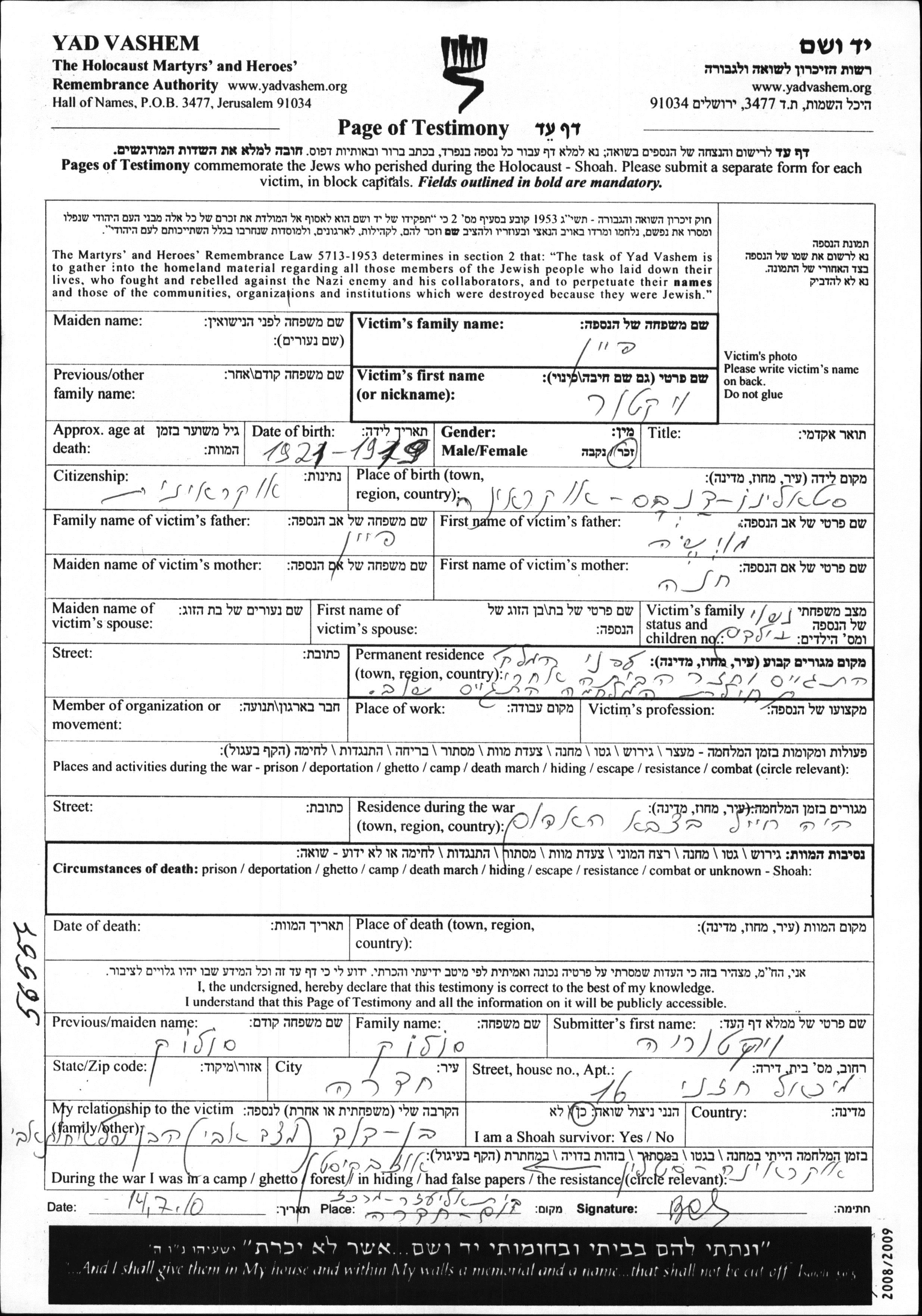 Viktor Fein est né à Stalino, Ukraine (URSS) en 1920, fils de Moshe et de Khana. Il était Marié. Avant la seconde guerre mondiale il vivait à Stalino, Ukraine (URSS). Au cours de la guerre, il était à the Soviet armed forces. Viktor a été tué en tant que militaire pendant la Seconde Guerre mondiale.