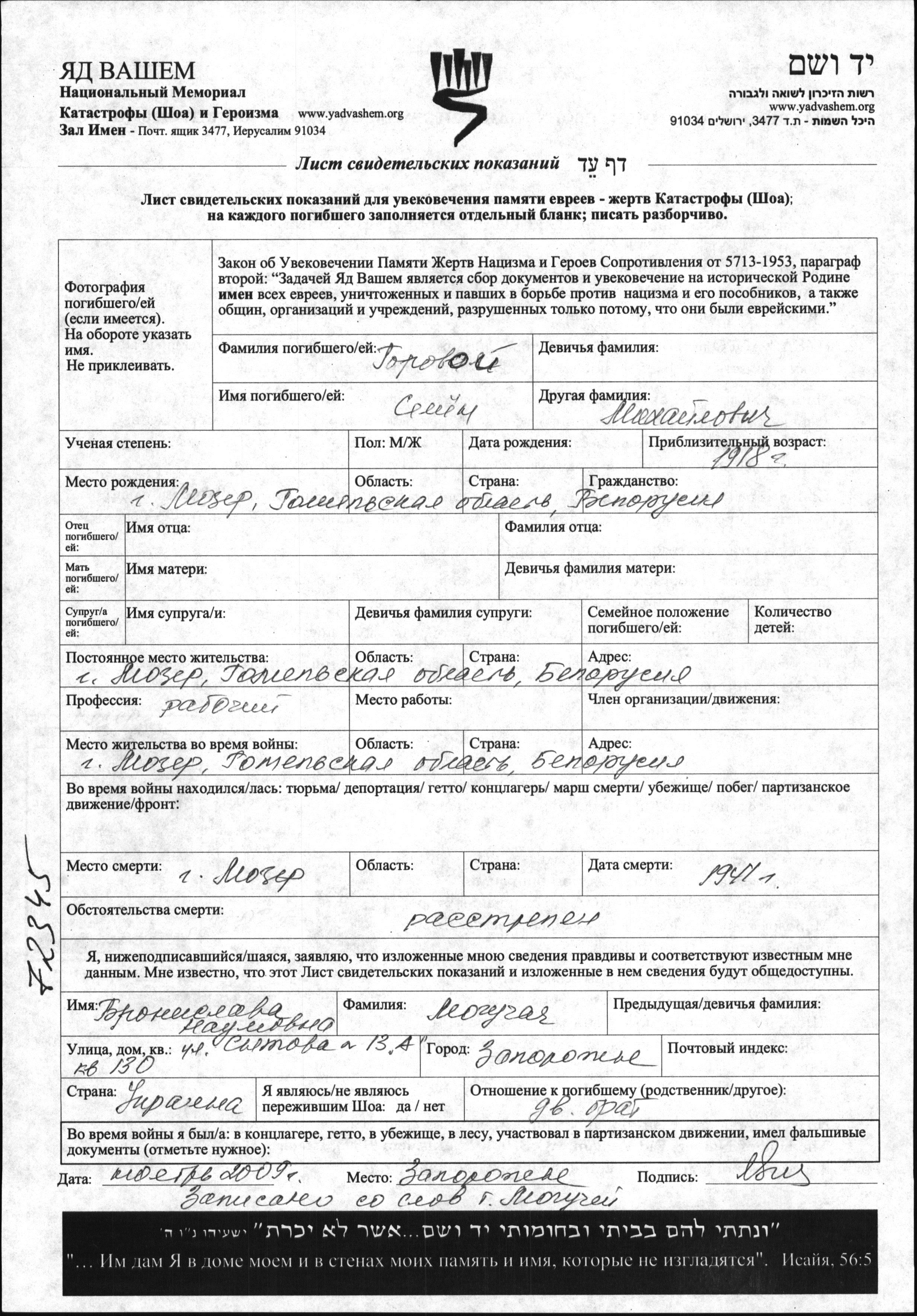 Semyon a été assassiné pendant la Shoah. Lieu de la mort: Mozyr, Bélorussie (URSS) en 1941.