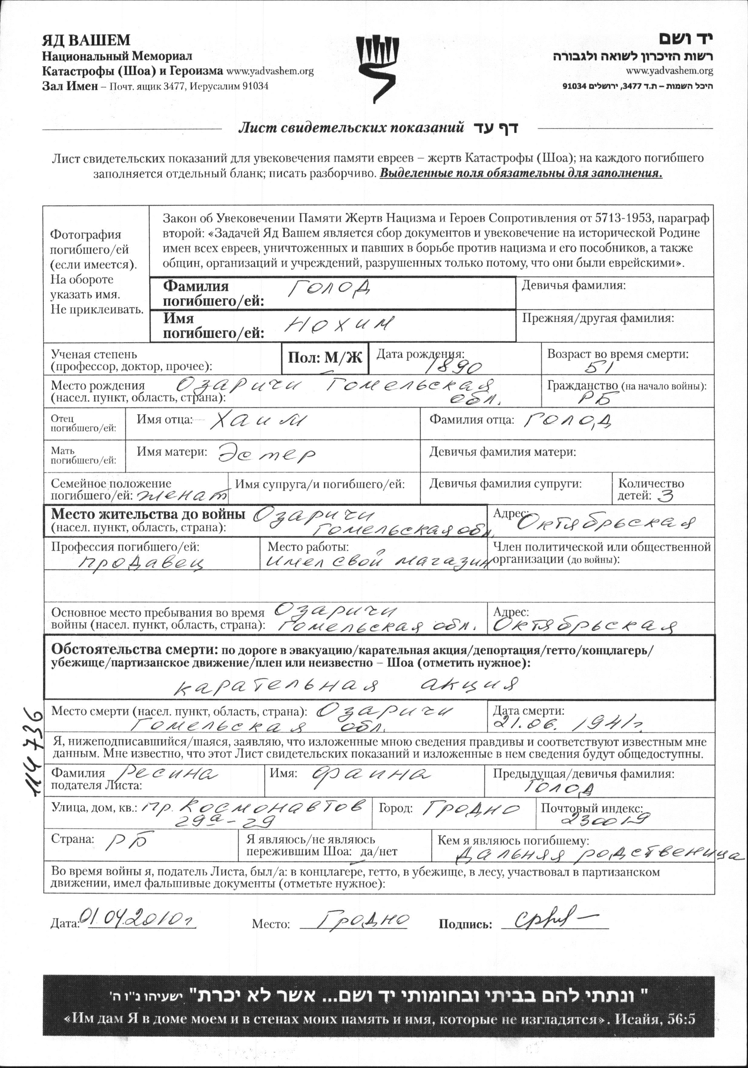Nokhim Golod est né à Ozarichi, Bélorussie (URSS) en 1890, fils de Khaim et de Ester. Il était Propriétaire d'un magasin et Marié. Avant la seconde guerre mondiale il vivait à Ozarichi, Bélorussie (URSS). Au cours de la guerre, il était à Ozarichi, Bélorussie (URSS).