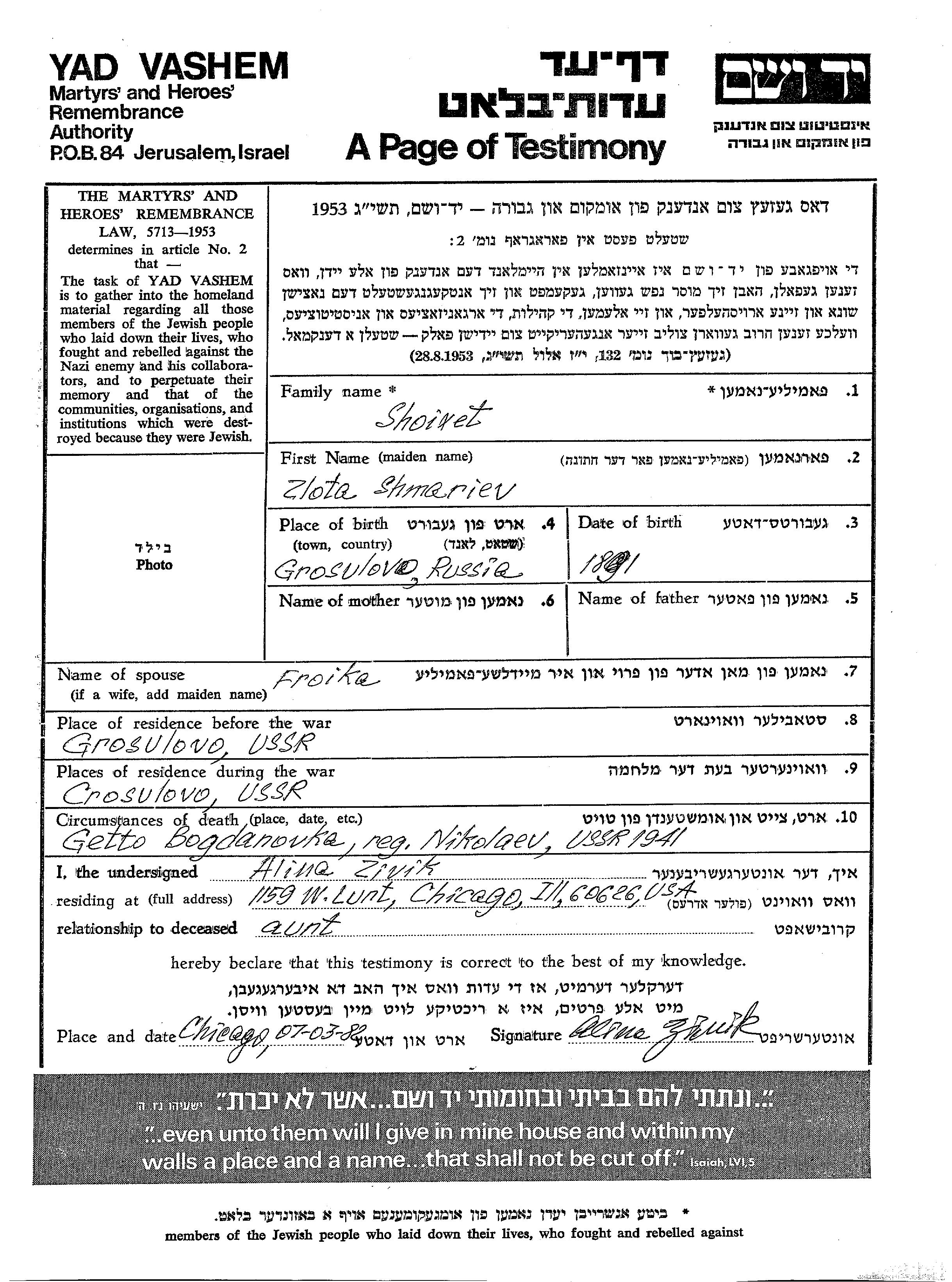 Shoixet Zlata 1891 Grosulovo, Ukraine (URSS) Feuille de témoignage