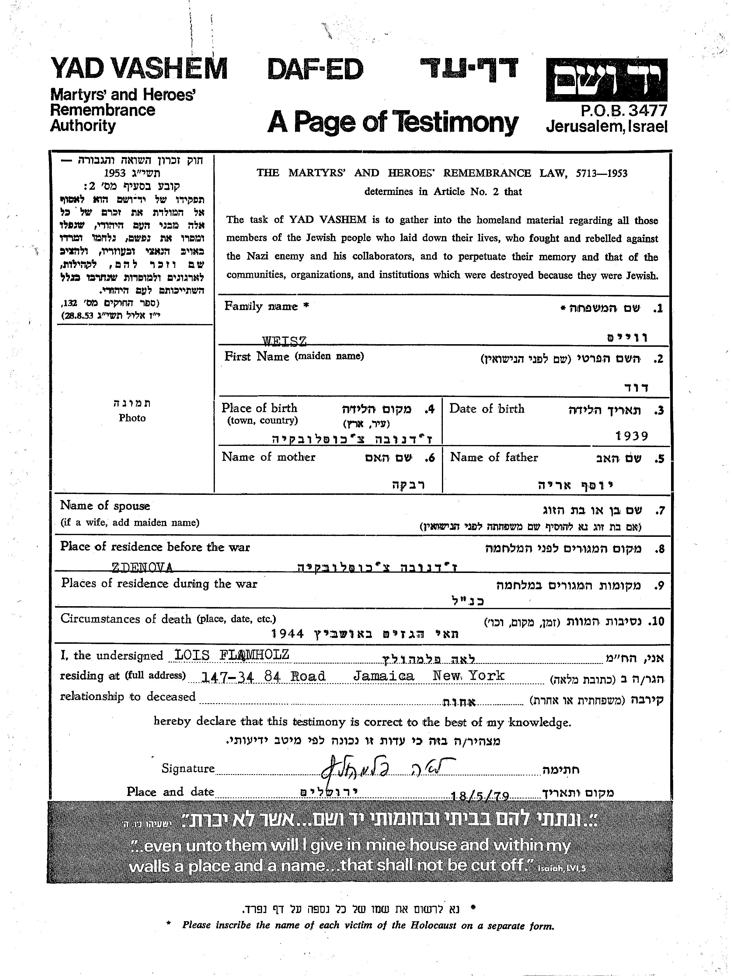 Weisz David 1939 Zdenova, Tchécoslovaquie Feuille de témoignage