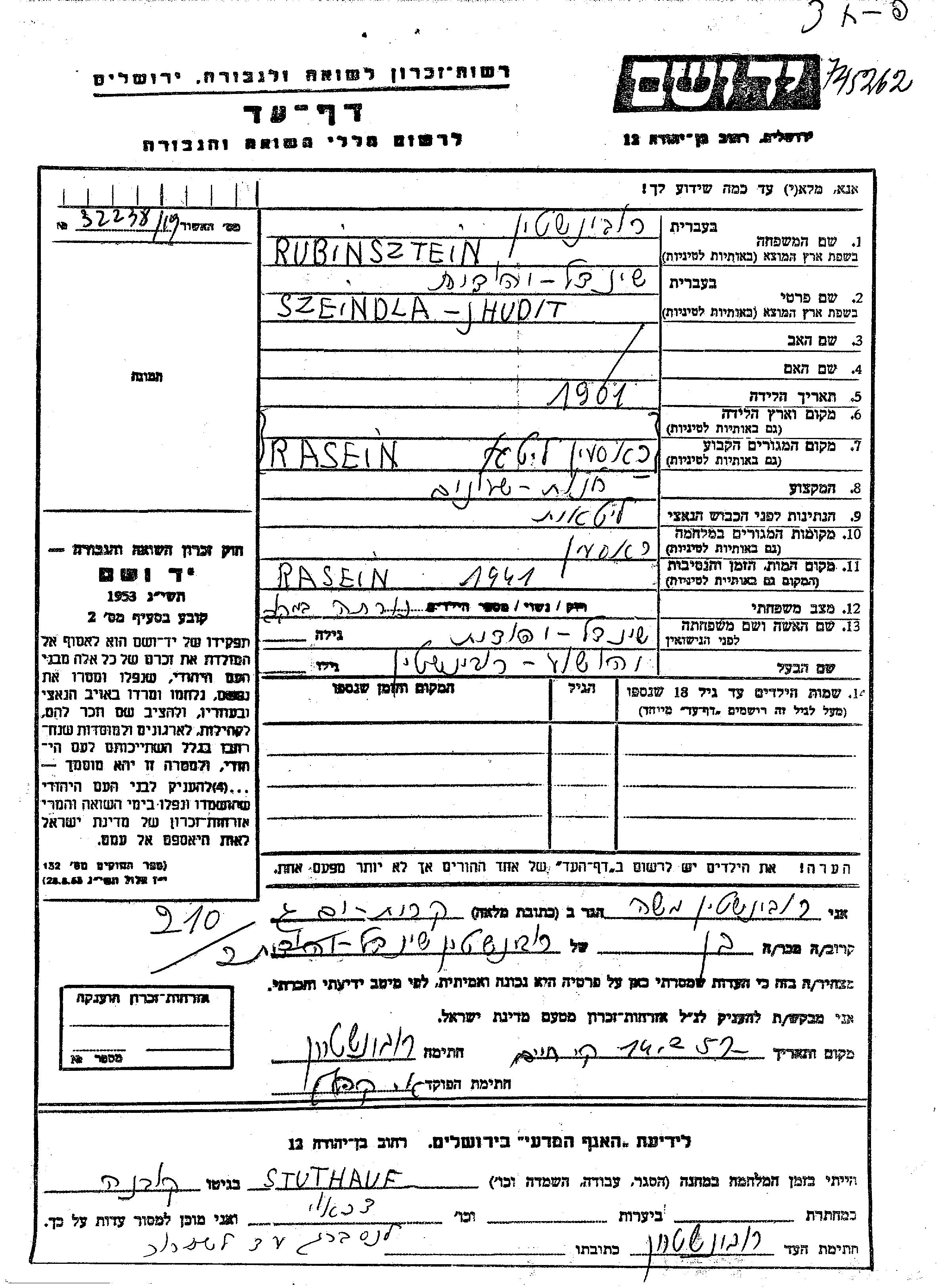 Rubinsztein Szeindla Jhudit 1901 Rasein, Lituanie Feuille de témoignage