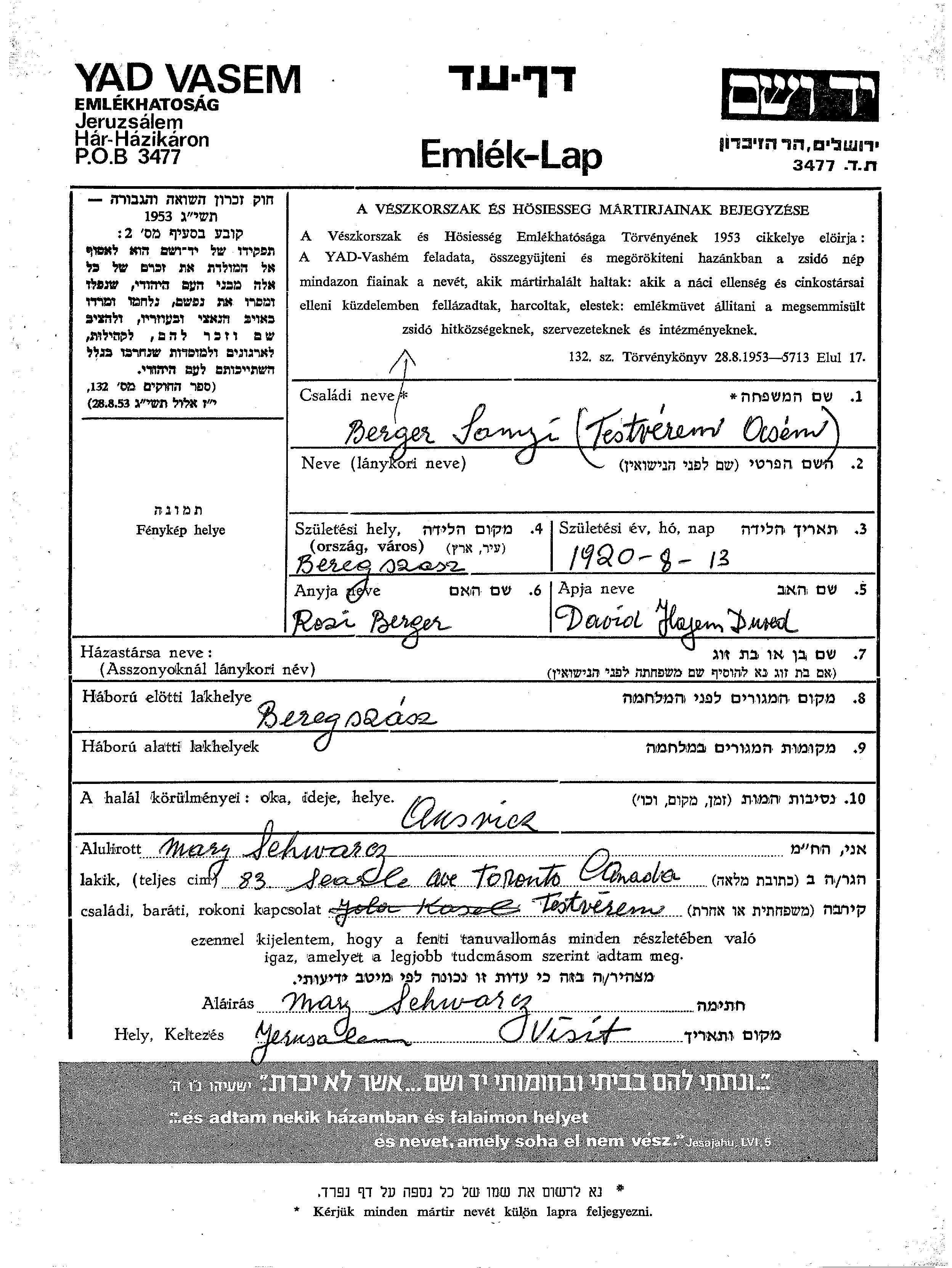 Berger Sanyi 1920 Beregszasz, Tchécoslovaquie Feuille de témoignage