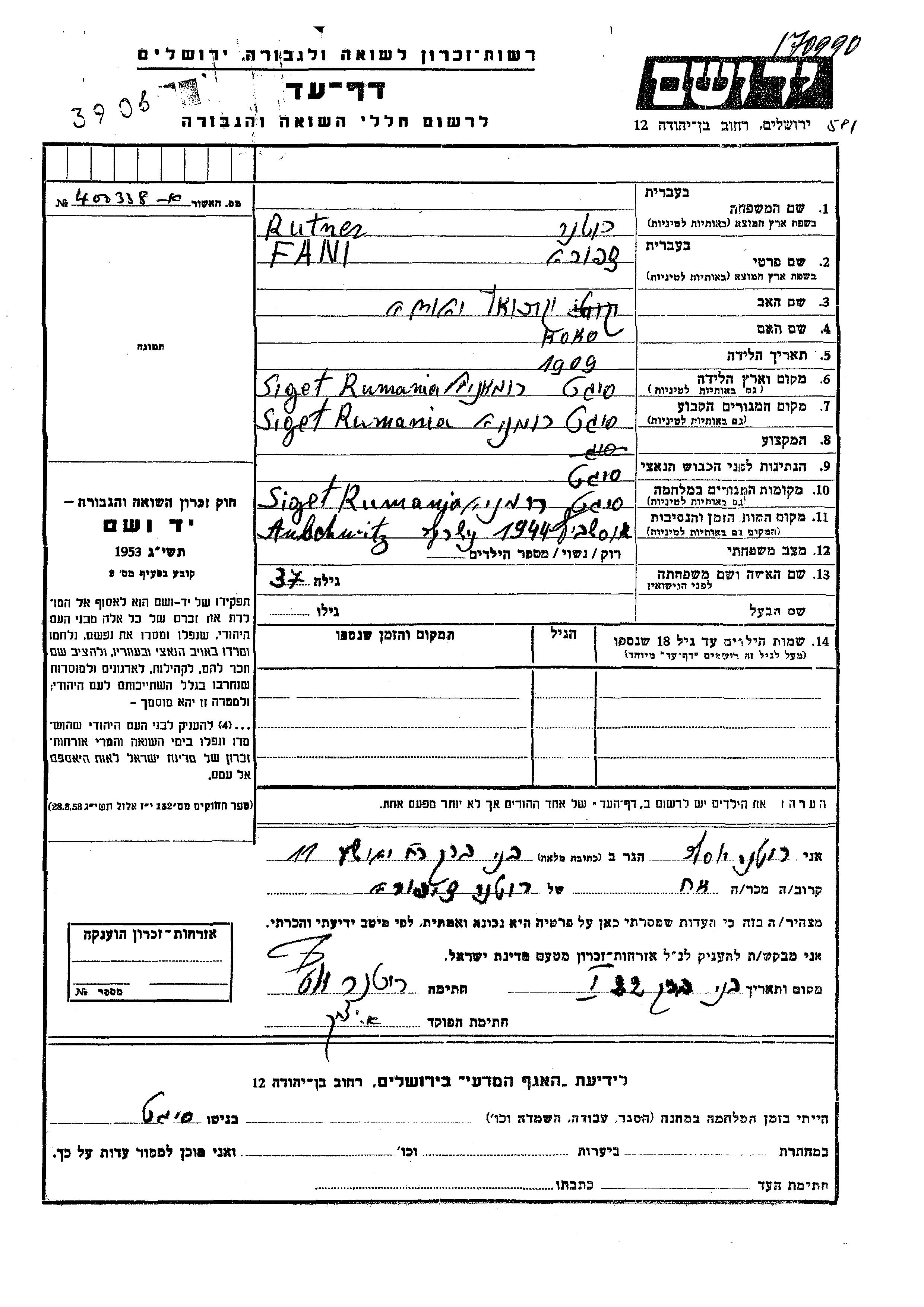 Rutner Fani Tzipora 1909 Siget, Roumanie Feuille de témoignage