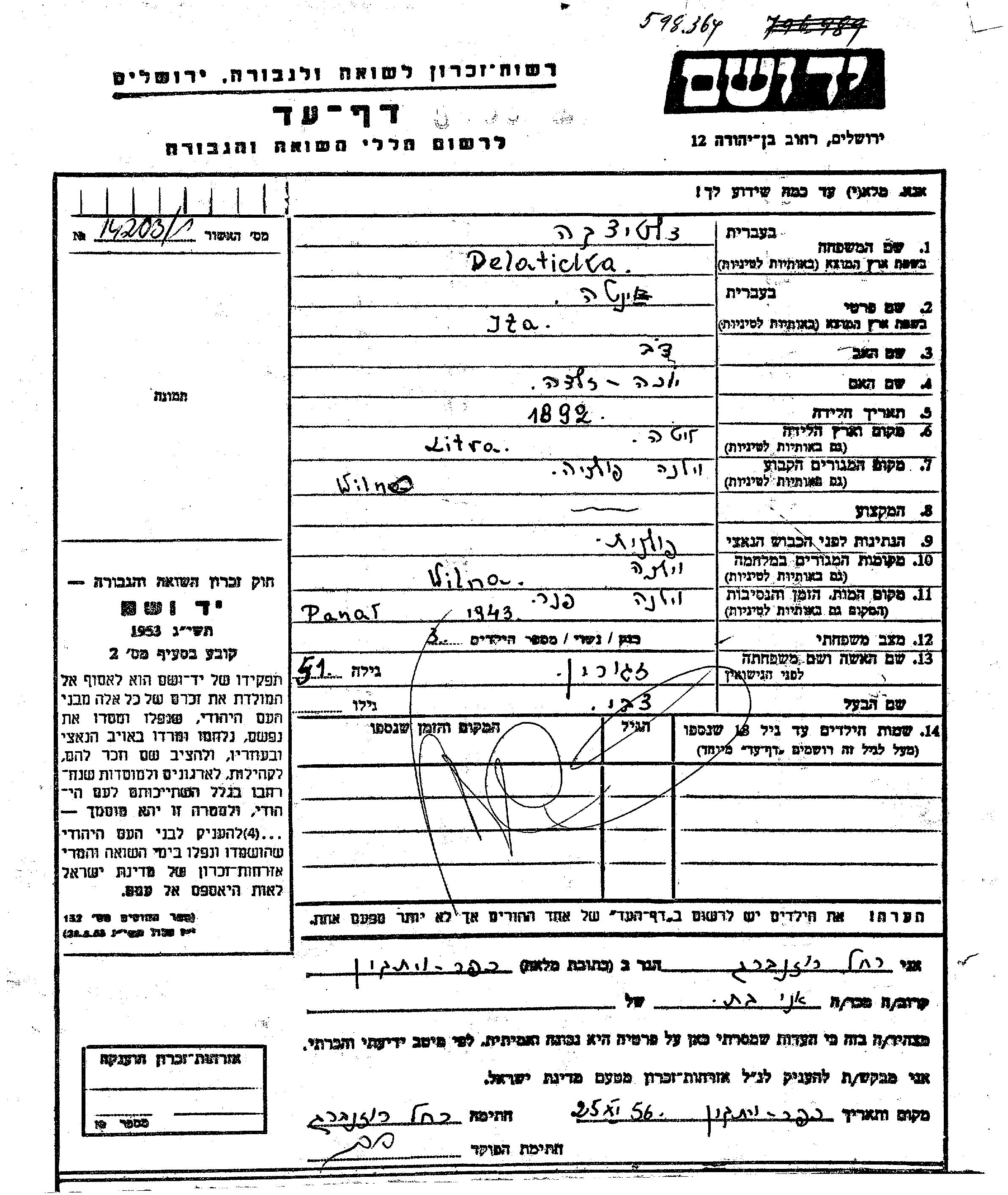 Delaticka Ita Yenta 1892 Wilno, Pologne Feuille de témoignage