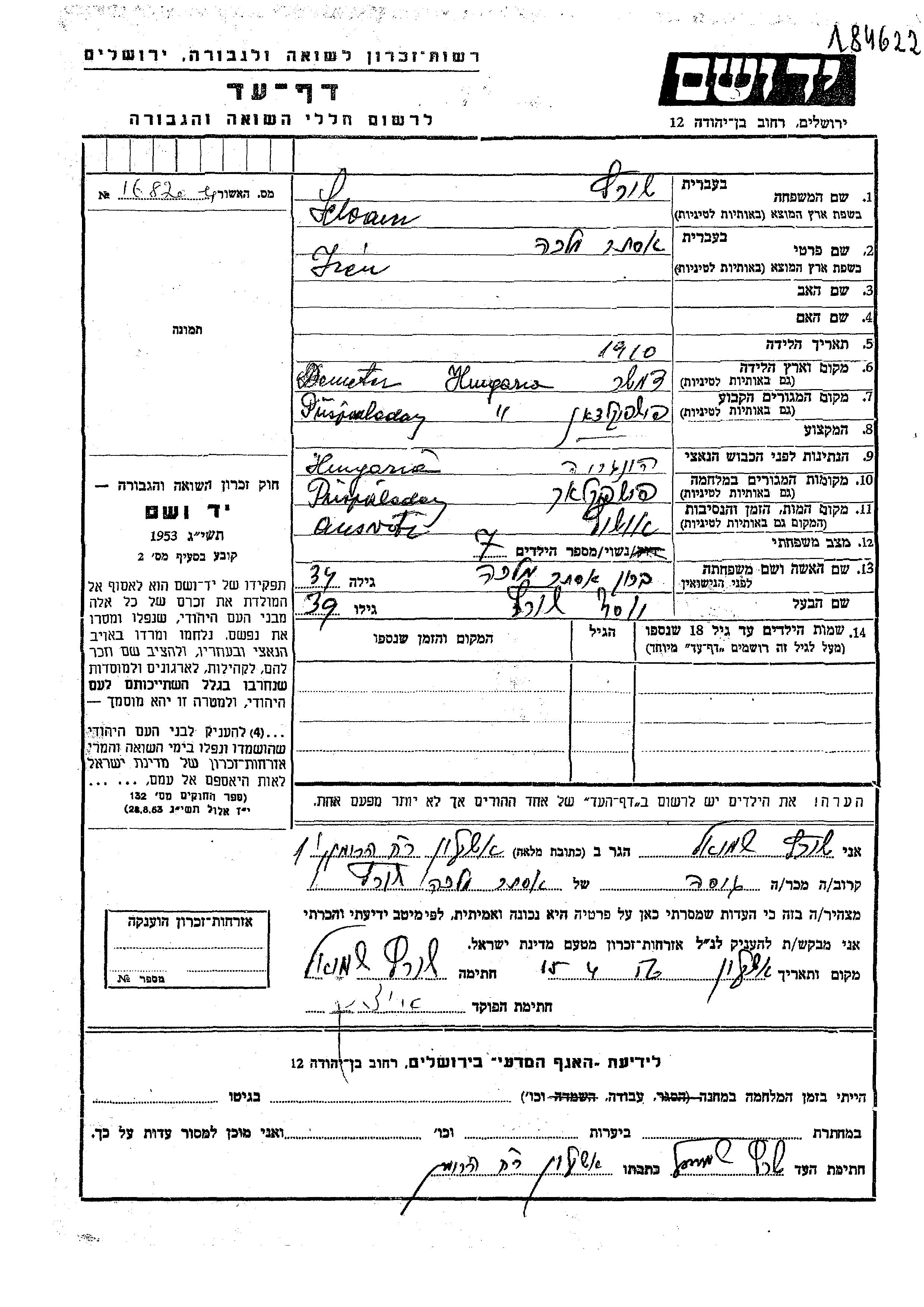 Yad Vashem - Pages of Testimony Names Memorial Collection