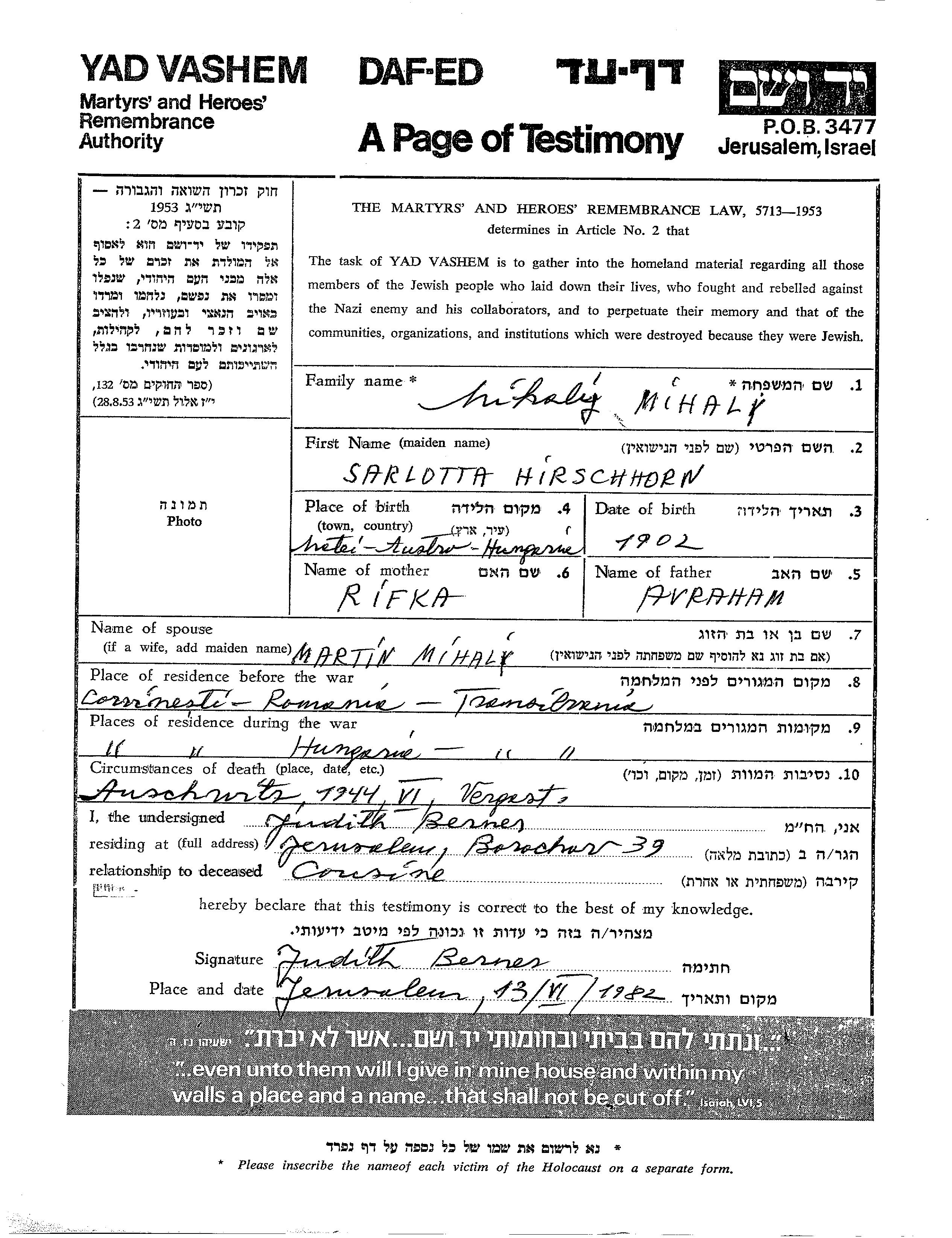 Sarlotta Suraly Mihaly née Hirschhorn est née à Matei, Roumanie en 1902, fille de Avraham et de Rivka. Elle était Mariée à Martin. Avant la seconde guerre mondiale elle vivait à Corvinesti, Roumanie. Pendant la guerre, elle était à Corvinesti, Roumanie.
