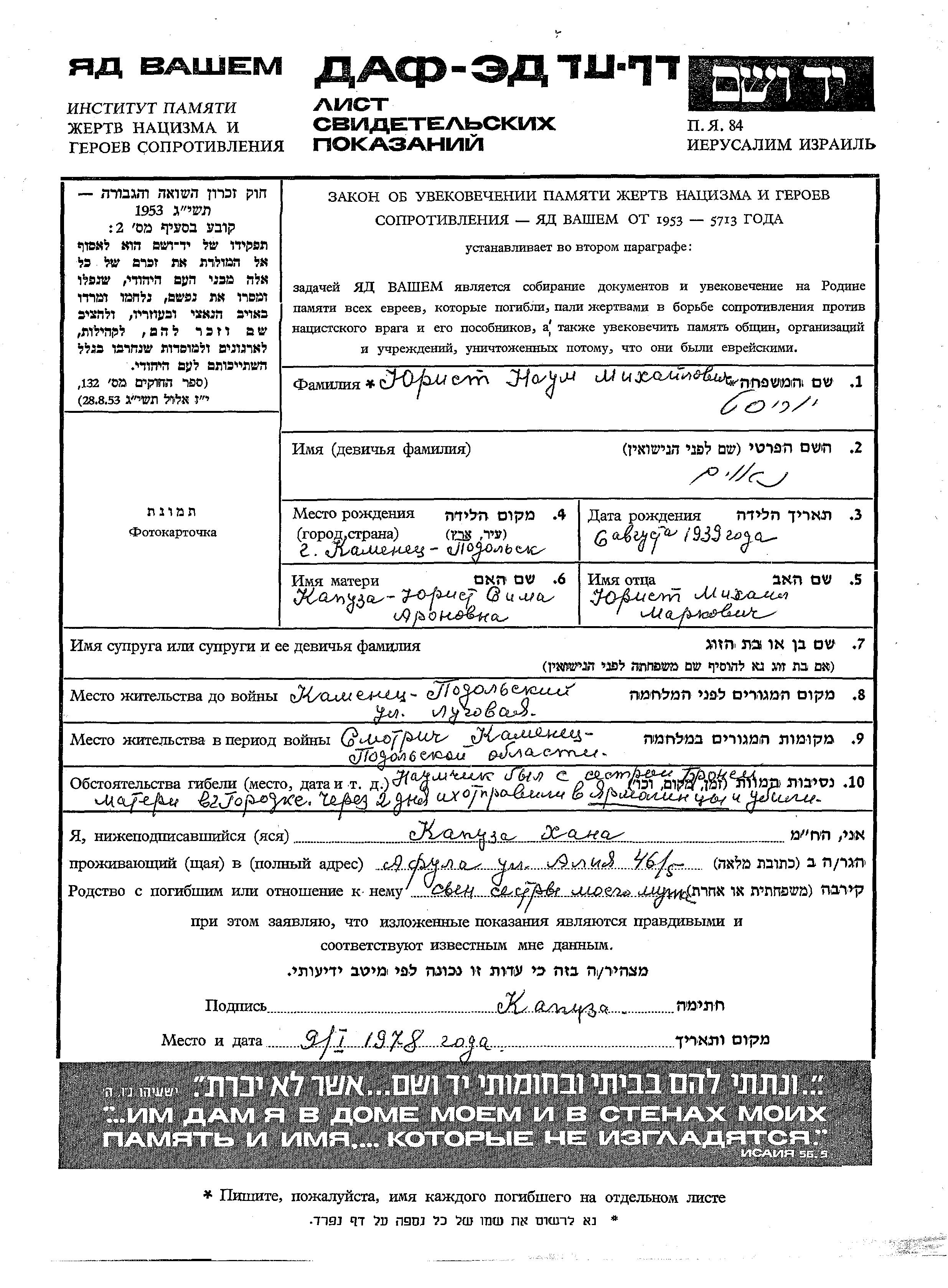 Iurist Nakhum 1939 Kamenets Podolskiy, Ukraine (URSS) Feuille de témoignage